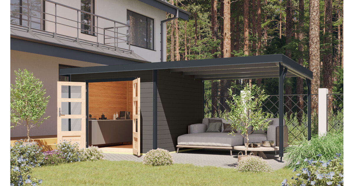 Mit dem optionalen Anbaudach erhalten Sie zusätzlichen Stauraum und erweiterte Nutzungsmöglichkeiten als Gartenlounge. Machen Sie es zu Ihrem persönlichen Rückzugsort.