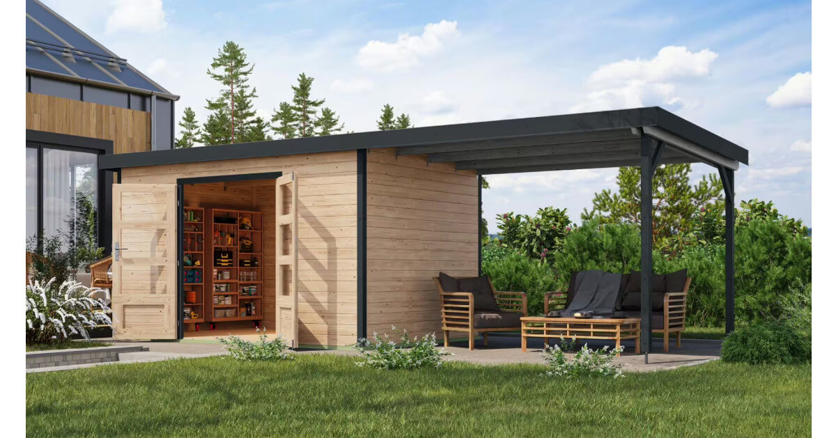 Mit dem optionalen Anbaudach erhalten Sie zusätzlichen Stauraum und erweiterte Nutzungsmöglichkeiten als Gartenlounge. Machen Sie es zu Ihrem persönlichen Rückzugsort.
