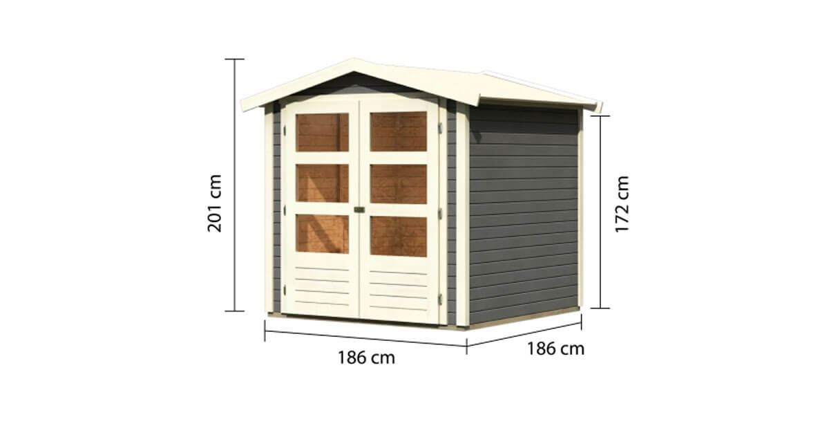Ein klassisches Gartenhaus - unter diesem Motto lässt sich das Gartenhaus Amberg 2 zusammenfassen. Das Satteldachhaus besteht aus 19mm starker, nordischer Fichte im klassischen Steck- und Schraubsystem. Dieses ermöglicht einen einfachen und schnellen Aufbau, wofür kein großes handwerkliches Geschick erforderlich ist. Das Satteldach mit einer Dachfläche von 4,2m² macht aus dem Gartenhaus einen echten Klassiker und ein Muss für Ihren Garten. Das Gartenhaus ist in der Farbe terragrau und in naturbelassen erhältlich, lässt sich ganz individuell gestalten und lässt sich so optimal Ihren Wünschen und Bedürfnissen anpassen. Die Doppelflügeltür mit drei Lichtausschnitten pro Türflügel rundet das Äußere des Gartenhauses ab und lässt Tageslicht hinein. Geschützt vor unbefugten Eindringen wird das Gartenhaus mit einer Sicherheitsüberfalle. Auch der Innenraum bietet viele Gestaltungsmöglichkeiten. Mit einem Innenmaß von (BxT) 178x178cm eignet es sich ideal für eine gemütliche Sitzlounge, die zum Entspannen im eigenen Garten einlädt. Durch die klassische Optik des Gartenhauses fügt es sich in das Gesamtbild des Gartens optimal ein. Runden Sie Ihr Gartenhaus mit dem passenden Zubehör ab. Durch eine Holzdachrinne, Dachschindeln als Dachbedeckung oder den passenden Fußboden verleihen Sie Ihrem Gartenhaus den letzten Schliff. Erweitern Sie die Möglichkeiten im eigenen Garten mit dem Gartenhaus Amberg 2.