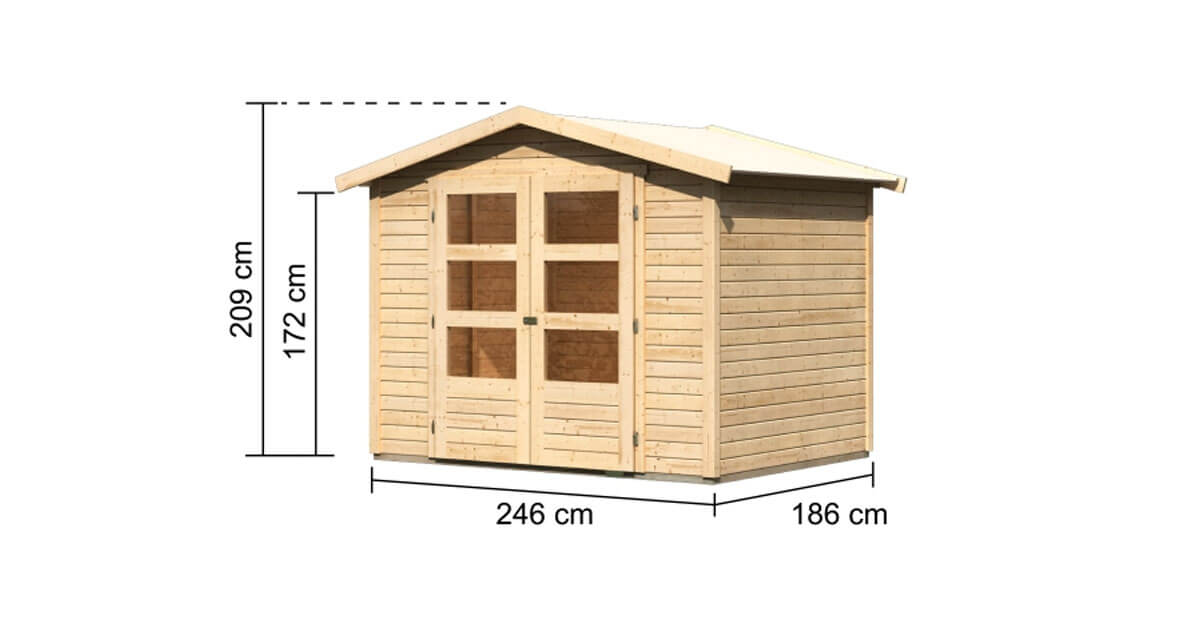 Ein klassisches Gartenhaus - unter diesem Motto lässt sich das Gartenhaus Amberg 3 zusammenfassen. Das Satteldachhaus besteht aus 19mm starker, nordischer Fichte im klassischen Steck- und Schraubsystem. Dieses ermöglicht einen einfachen und schnellen Aufbau, wofür kein großes handwerkliches Geschick erforderlich ist. Das Satteldach mit einer Dachfläche von 5,8m² macht aus dem Gartenhaus einen echten Klassiker und ein Muss für Ihren Garten. Das Gartenhaus ist in der Farbe terragrau und in naturbelassen erhältlich, lässt sich ganz individuell gestalten und lässt sich so optimal Ihren Wünschen und Bedürfnissen anpassen. Die Doppelflügeltür mit drei Lichtausschnitten pro Türflügel rundet das Äußere des Gartenhauses ab und lässt Tageslicht hinein. Geschützt vor unbefugten Eindringen wird das Gartenhaus mit einer Sicherheitsüberfalle. Auch der Innenraum bietet viele Gestaltungsmöglichkeiten. Mit einem Innenmaß von (BxT) 238x178cm eignet es sich ideal für eine gemütliche Sitzlounge, die zum Entspannen im eigenen Garten einlädt. Durch die klassische Optik des Gartenhauses fügt es sich in dasGesamtbild des Gartens optimal ein. Runden Sie Ihr Gartenhaus mit dem passenden Zubehör ab. Durch eine Holzdachrinne, Dachschindeln als Dachbedeckung oder den passenden Fußboden verleihen Sie Ihrem Gartenhaus den letzten Schliff. Erweitern Sie die Möglichkeiten im eigenen Garten mit dem Gartenhaus Amberg 3.