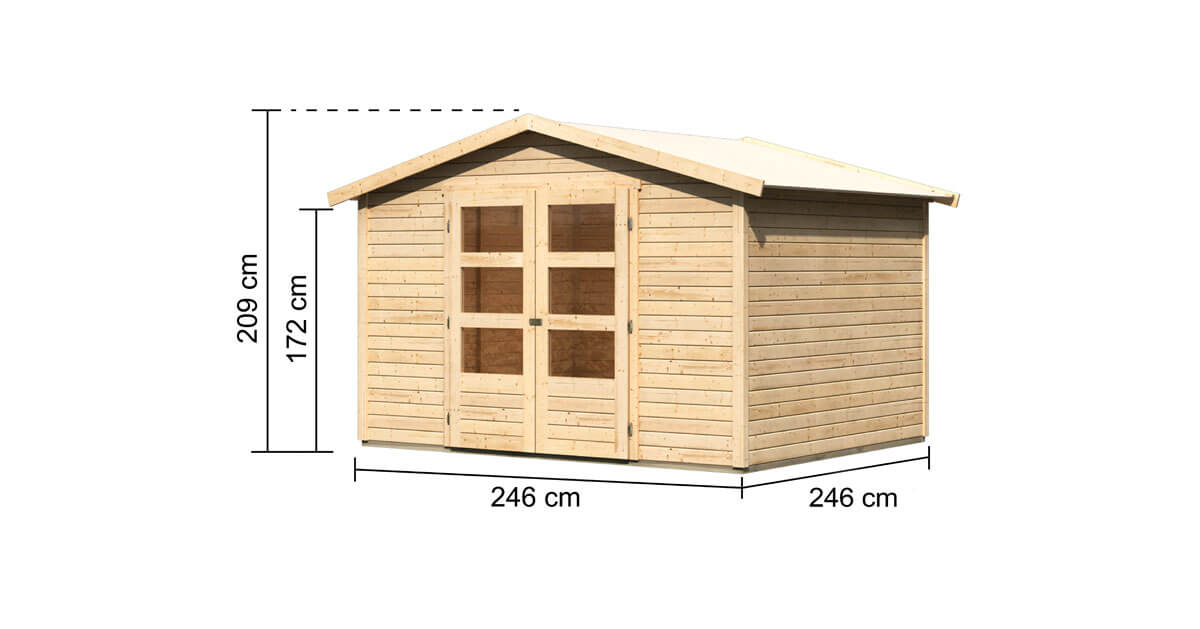 Ein klassisches Gartenhaus - unter diesem Motto lässt sich das Gartenhaus Amberg 4 zusammenfassen. Das Satteldachhaus besteht aus 19mm starker, nordischer Fichte im klassischen Steck- und Schraubsystem. Dieses ermöglicht einen einfachen und schnellen Aufbau, wofür kein großes handwerkliches Geschick erforderlich ist. Das Satteldach mit einer Dachfläche von 7,8m² macht aus dem Gartenhaus einen echten Klassiker und ein Muss für Ihren Garten. Das Gartenhaus ist in der Farbe terragrau und in naturbelassen erhältlich, lässt sich ganz individuell gestalten und lässt sich so optimal Ihren Wünschen und Bedürfnissen anpassen. Die Doppelflügeltür mit drei Lichtausschnitten pro Türflügel rundet das Äußere des Gartenhauses ab und lässt Tageslicht hinein. Geschützt vor unbefugten Eindringen wird das Gartenhaus mit einer Sicherheitsüberfalle. Auch der Innenraum bietet viele Gestaltungsmöglichkeiten. Mit einem Innenmaß von (BxT) 238x238cm eignet es sich ideal für eine gemütliche Sitzlounge, die zum Entspannen im eigenen Garten einlädt. Durch die klassische Optik des Gartenhauses fügt es sich in das Gesamtbild des Gartens optimal ein. Runden Sie Ihr Gartenhaus mit dem passenden Zubehör ab. Durch eine Holzdachrinne, Dachschindeln als Dachbedeckung oder den passenden Fußboden verleihen Sie Ihrem Gartenhaus den letzten Schliff. Erweitern Sie die Möglichkeiten im eigenen Garten mit dem Gartenhaus Amberg 4.