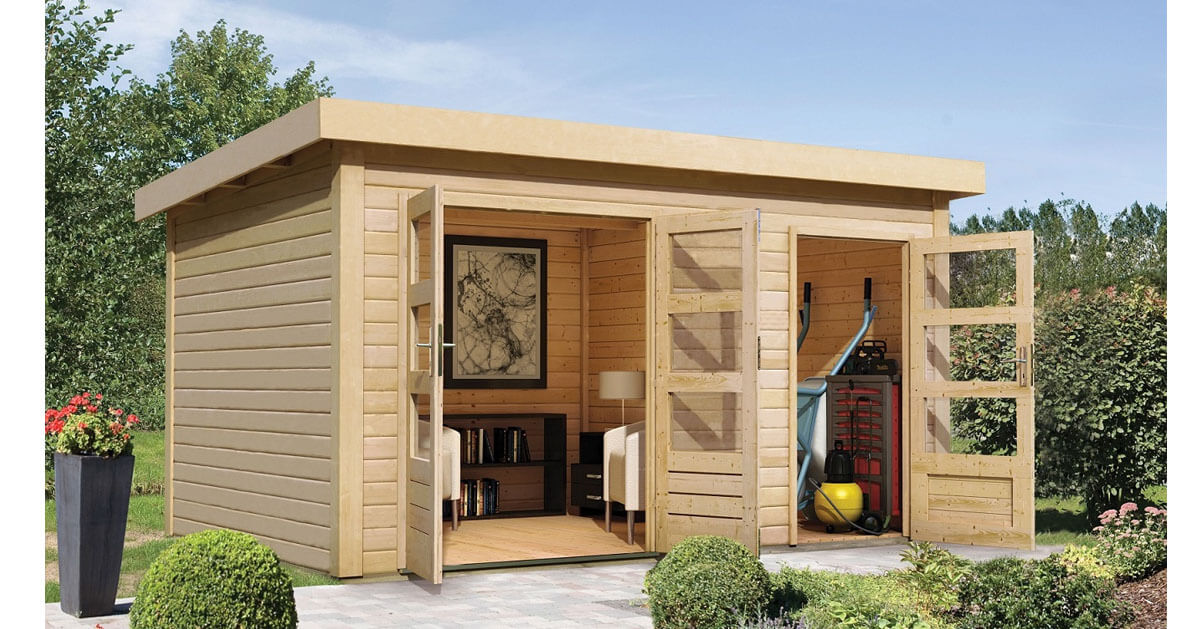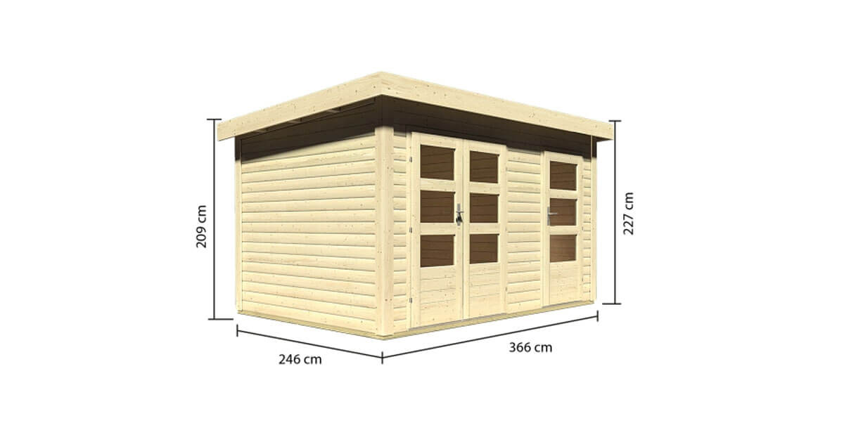 Suchen Sie nach einer Möglichkeit Ihre Gartengeräte nach getaner Arbeit zu verstauen und möchten das Gartenhaus gleichzeitig als geschützte Möglichkeit für eine gemütliche Sitzgruppe nutzen? Dann informieren Sie sich über das Gartenhaus Schönbuch 1. Mit einer Wandstärke von 38mm mit Doppelnut und -feder aus nordischem Fichtenholz ist das Gartenhaus besonders stabil. Durch die 28mm Mittelwand tuen sich Ihnen gleich zwei Nutzungsmöglichkeiten auf. So können Sie nicht nur Ihre Gegenstände lagern und verstauen, sondern sich gleichzeitig im anderen Raum einen gemütlichen Rückzugsort einrichten. Das Gartenhaus hat ein Außenmaß von (BxT) 366x246cm und passt somit in fast jeden Garten. Wer möchte seinen Garten nach getaner Arbeit nicht gerne noch genießen? Mit dem Gartenhaus Schönbuch stehen Ihnen viele Möglichkeiten uneingeschränkt zur Verfügung. Auch das Unterstellen von Fahrrädern oder anderen größeren Gegenständen ist möglich. Mit dem passenden Zubehör können Sie das Haus zum Beispiel mit einem Fußboden oder einer Holzdachrinne optisch abrunden. Vor aufsteigender Nässe schützen die im Lieferumfang enthaltenen kesseldruckimprägnierten Bodenbalken. Ein Haus mit vielen Möglichkeiten - dafür steht das Schönbuch 1.