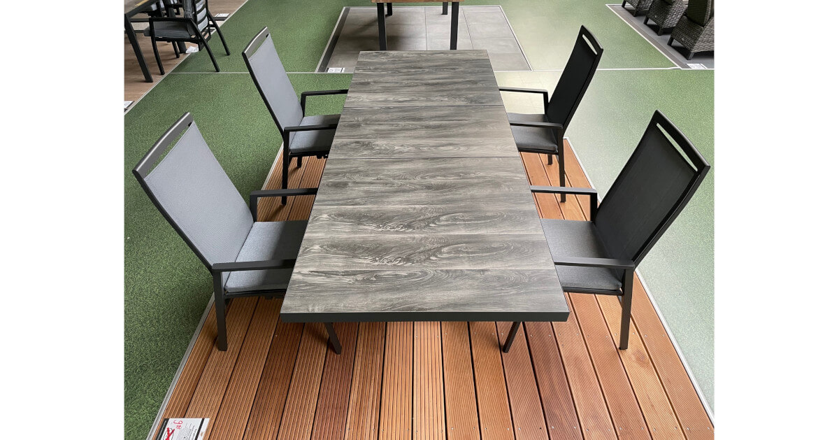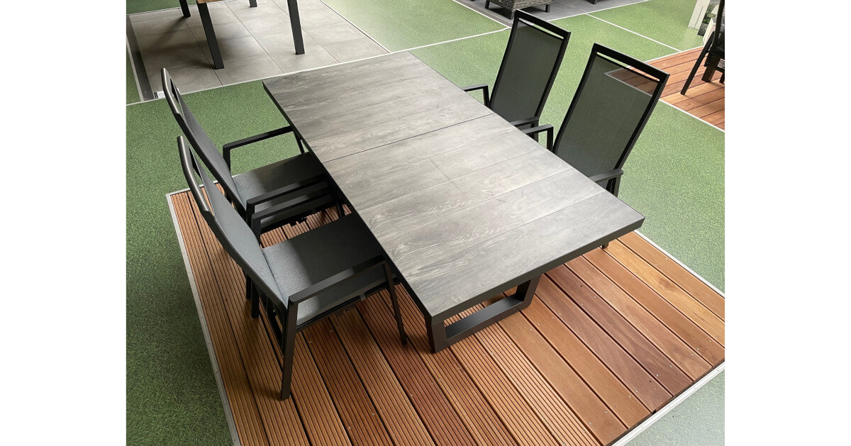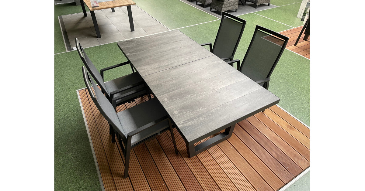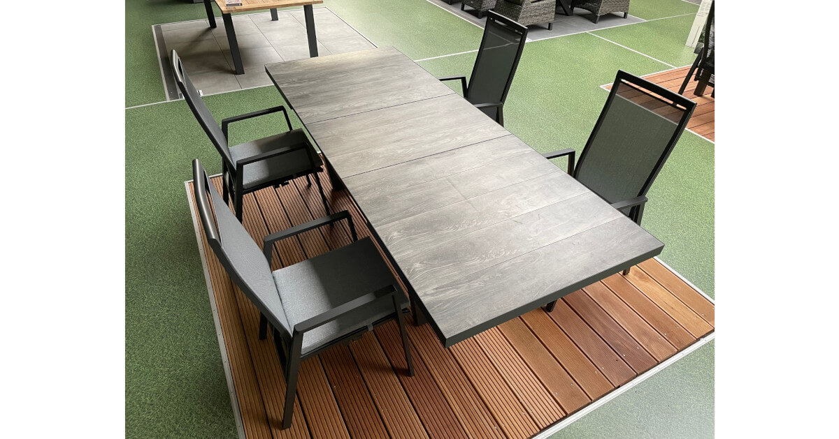 Unsere Luxus-Essgruppe aus der neuen Möbelserie Keramo überzeugt durch Funktionaltät und ansprechendem Design. Die konsequente Weiterentwicklung der Serie Barcelona, nun mit eleganten Armlehnen aus Aluminium. Begeistern Sie sich und Ihre Gäste mit dieser neu entwickelten Gartensitzgruppe »Keramo« Dining. Dank stufenlos verstellbarer Rückenlehne und kombiniertem Sitz- und Rückenpolster bieten Ihnen die Gartenstühle jederzeit ein optimales Sitzkomfort. Der Keramiktsch bietet Platz für bis zu 8 Personen. Dank der ausziehbaren Verstellung kann der Gartentisch problemlos von 200cm auf 260cm ausgezogen werden. Die Tischplatte des Keramo Esstisches besteht aus grauen Keramikplatten in Holzoptik, welche extrem kratz- und stoßfest sind. Die Kombination aus dem anthrazitfarbenen Rahmen, dem grau-melierten Polyrattangeflecht und der passenden Auflage wird Ihre Terrasse oder den Wintergarten optisch bereichern. Gönnen Sie sich den Luxus von hochwertigen und langlebigen Möbeln für den Außenbereich.