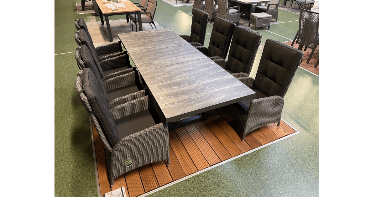 Unsere Luxus-Essgruppe aus der neuen Möbelserie Keramo überzeugt durch Funktionaltät und ansprechendem Design. Begeistern Sie sich und Ihre Gäste mit dieser neu entwickelten Gartensitzgruppe »Keramo« Dining. Dank stufenlos verstellbarer Rückenlehne und kombiniertem Sitz- und Rückenpolster bieten Ihnen die Gartenstühle jederzeit ein optimales Sitzkomfort. Der Keramiktsch bietet Platz für bis zu 8 Personen. Dank der ausziehbaren Verstellung kann der Gartentisch problemlos von 200cm auf 260cm ausgezogen werden. Die Tischplatte des Keramo Esstisches besteht aus grauen Keramikplatten in Holzoptik, welche extrem kratz- und stoßfest sind. Die Kombination aus dem anthrazitfarbenen Rahmen, dem grau-melierten Polyrattangeflecht und der passenden Auflage wird Ihre Terrasse oder den Wintergarten optisch bereichern. Gönnen Sie sich den Luxus von hochwertigen und langlebigen Möbeln für den Außenbereich.