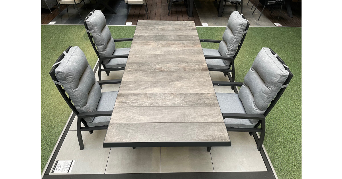 Wer das Besondere liebt und gerne auf jede Gelegenheit vorbereitet sein möchte, ist mit diesem ausziehbaren Automatik-Esstisch bestens bedient. Der Tisch ist ca. 100 cm breit und ca. 77 cm hoch, im normalen Zustand hat er eine Länge von ca. 200 cm - so steht dem gemütlichen Mittagessen mit der Familie nichts mehr im Wege. Das Gestell wurde aus pulverbeschichtetem Aluminium in Anthrazit hergestellt, was den Tisch besonders haltbar macht. Die Tischplatte besteht aus hochwertigem Keramik. Die Platte zum Erweitern des Tisches ist ebenfalls aus Keramik gefertigt und lässt sich ganz einfach ausziehen. Man zieht einfach die beiden oberen Platten auseinander und die darunterliegende Keramikplatte schwenkt aufgrund der Automatikfunktion nach oben, und schon ist der Tisch auf ca. 260 cm erweitert - perfekt für spontane, große Runden. Die Unterschubhöhe beträgt ca. 68 cm - so kann man gemütlich mit vielen Arten von Sesseln an diesem Tisch Platz nehmen. Der Tisch hat ein Gewicht von ca. 93,5 kg, und ist somit perfekt gegen Windstöße geschützt. Die Fußkappen bestehen aus schwarzem Kunststoff und schützen den Boden vor unschönen Kratzern beim Verrücken des Möbelstücks.