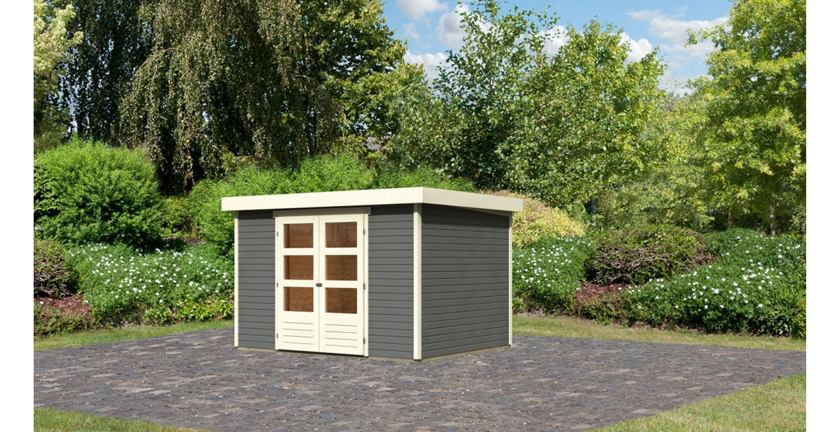 Das Gartenhaus Askola 5 strahlt mit seiner natürlichen Schönheit in naturbelassenem, nordischem Fichtenholz oder im Karibu-Farbsystem lackiertem terragrau. Das 19mm Systemhaus wird durch ein einfaches Steck-und Schraubsystem aufgebaut und verlangt somit kein großes handwerkliches Geschick.