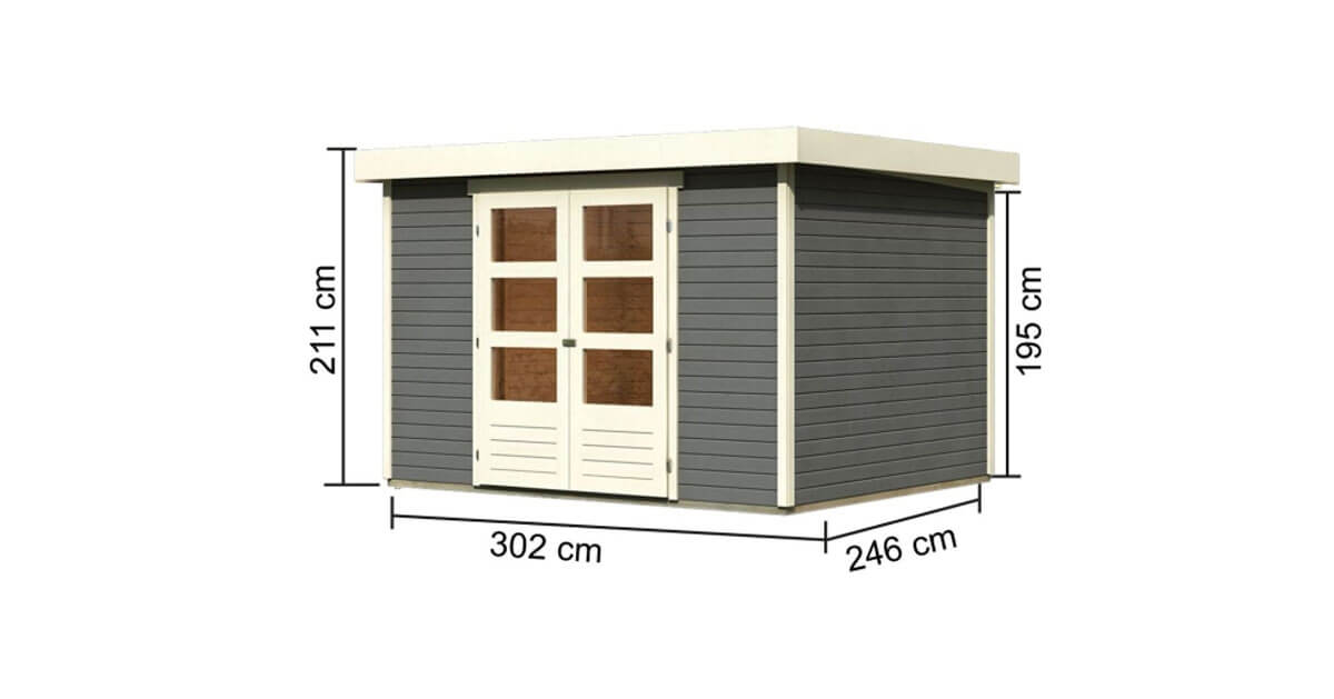 Mit einem Außenmaß von(BxT) 302x246cm besitzt es die ideale Größe, um Gartengeräte zu verstauen oder einen gemütlichen Rückzugsort zu schaffen. Das Gartenhaus ist optional mit einem Anbaudach in den Breiten 2,40m oder 2,80m erhältlich, welches zusätzlichen Raum bietet. Der neu gewonnene Platz eignet sich ideal als Unterstand für große Gartengeräte oder für eine bequeme Sitzgruppe im Freien. So können Sie Ihren Garten nicht nur bei Sonnenschein in vollen Zügen genießen.