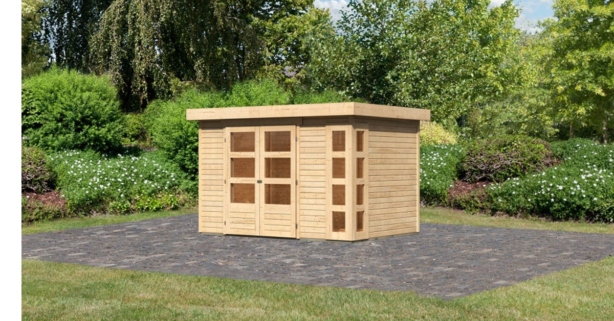 Heller Innenraum durch moderne Fensterecke - das Gartenhaus Kerko 4 sorgt so für ein optisches Highlight in Ihrem Garten. Das 19mm Flachdachhaus aus nordischer Fichte mit einer Firsthöhe von 211cm wird durch das Steck- und Schraubsystem schnell und einfach montiert.