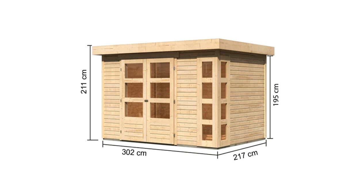 Die moderne Fensterecke mit 8 feststehenden Lichtausschnitten sorgt für viel Tageslicht im Innenraum und lässt ihn strahlen. Ob als Werkstatt, Fitnessraum oder für Ihre Gartengeräte. Das Gartenhaus Kerko mit einem Außenmaß von (BxT) 302x217cm bietet Ihnen viele Anwendungsmöglichkeiten.