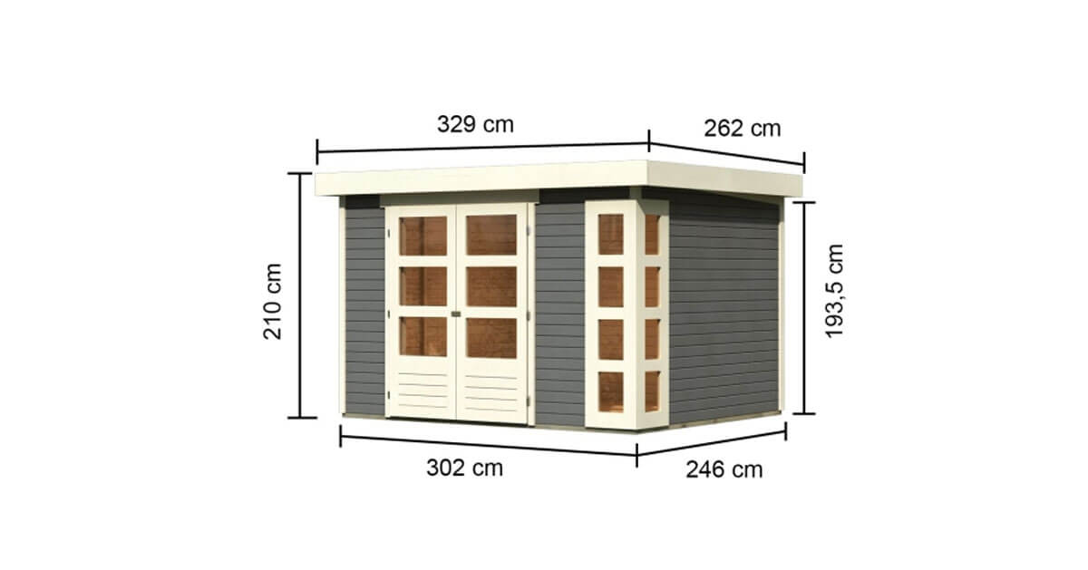 Die moderne Fensterecke mit 8 feststehenden Lichtausschnitten sorgt für viel Tageslicht im Innenraum und lässt ihn strahlen. Ob als Werkstatt, Fitnessraum oder für Ihre Gartengeräte. Das Gartenhaus Kerko mit einem Außenmaß von (BxT) 302 x 246 cm bietet Ihnen viele Anwendungsmöglichkeiten.