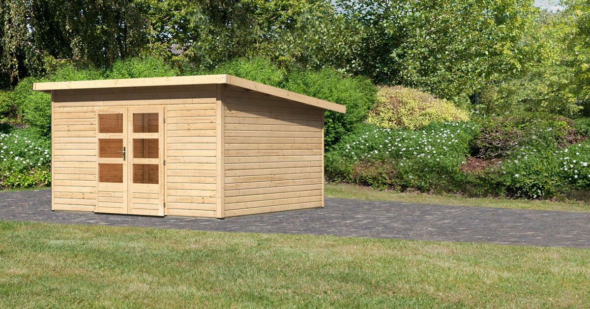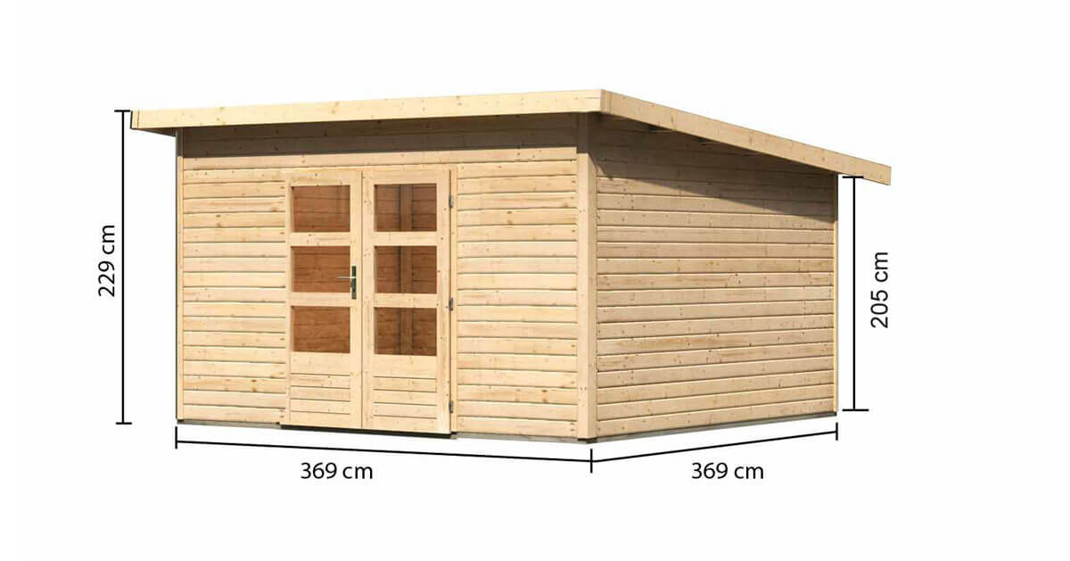 Ein stabiles Pultdachhaus mit vielen Möglichkeiten. Das Gartenhaus Northeim 5 besteht aus 38mm Massivholzbohlen mit Doppelnut und -feder. Das Haus aus nordischer Fichte ist in naturbelassen oder in der modernen Farbe terragrau erhältlich. Durch die Stärke der Bohlen gewinnt das Gartenhaus an Stabilität und dient so ideal als zweites kleines Heim im eigenen Garten. Durch die vielen verschiedenen Größen, in denen das Northeim erhältlich ist, passt es in nahezu jeden Garten. Dank der Doppelflügeltür mit drei Lichtausschnitten pro Türflügel und Buntbartschloss gelangt das Tageslicht in den Innenraum und sorgt für eine natürlich Lichtquelle. Für noch mehr Helligkeit im (BxT) 357x357cm großen Innenraum können zum Beispiel zwei optional erhältliche längliche Dreh-/Kippfenster neben der Tür montiert werden. Dies öffnet die Front des Hauses optisch und lässt von innen einen weiten Blick in Ihren Garten zu. Die Außenfläche des Gartenhauses Northeim 5 kann durch ein Anbaudach erweitert werden und bietet so noch mehr Platz. Dieser kann sinnvoll als Unterstand für Gartengeräte genutzt werden oder für eine gemütliche Sitzgruppe als Schutz vor dem Regen dienen. Das Gartenhaus Northeim 5 - das stabile Pultdachhaus mit vielen Möglichkeiten für Ihren Garten.