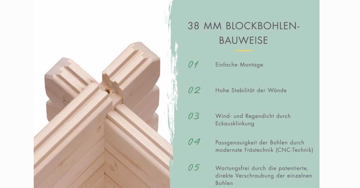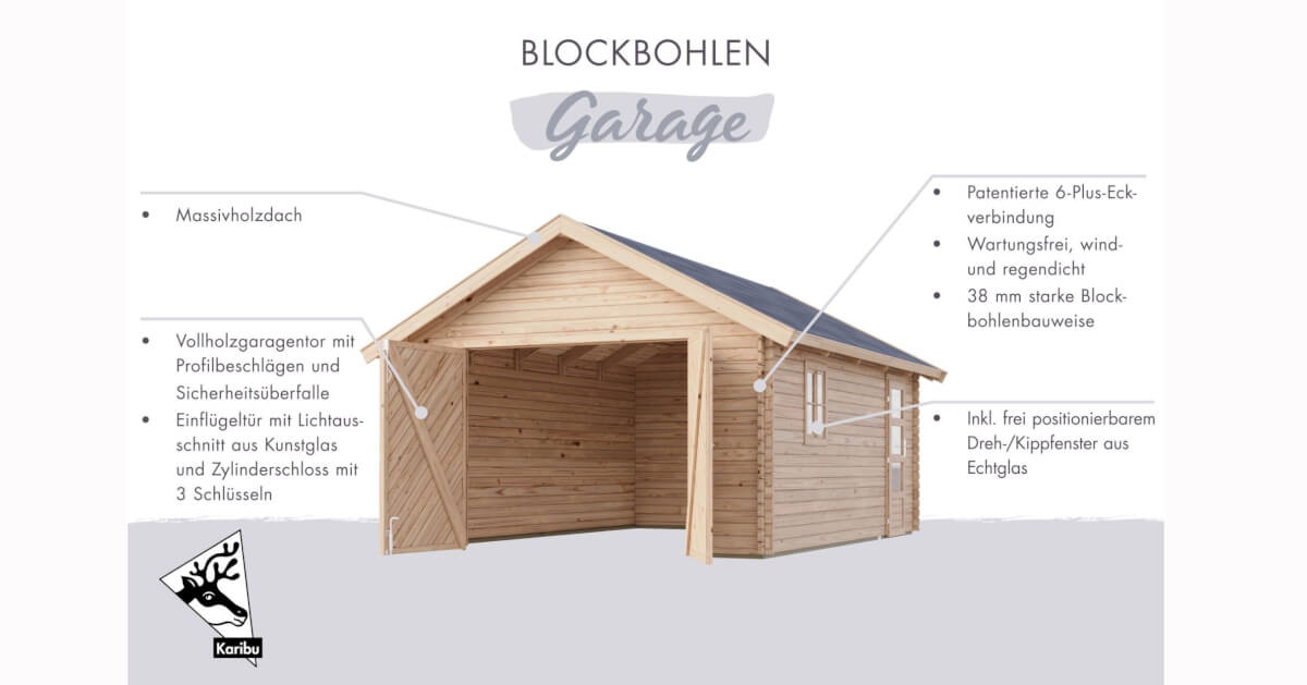 Kein lästiges Kratzen im Winter, keine Blüten oder Pollen auf der Scheibe und vor Diebstahl gesichert, das ist der Traum eines jeden Autobesitzers. Mit der Blockbohlengarage mit Satteldach kann dieser Traum problemlos in Erfüllung gehen. Die Garage besteht aus 40mm starken Wandbohlen, die in Blockbohlenbauweise montiert werden. Durch die patentiere 6-Plus-Eckverbindung erhält diese besondere Konstruktion eine zusätzliche Stabilität. Das klassische Satteldach besteht aus Massivholzbrettern und schützt Ihren PKW vor der Witterung. Ausgekleidet mit unseren optional erhältlichen Dachschindeln runden Sie die klassische Optik gekonnt ab und bietet Ihrem Eigentum einen Schutz über viele Jahre. Durch ein Vollholzgaragentor mit einem Durchfahrtsmaß von (BxT) 240x193cm inkl. Profilbeschlägen, sowie einer Sicherheitsüberfalle und einer Einflügeltür in der Seite mit einem Lichtausschnitt inkl. eines Buntbartschlosses mit zwei Schlüsseln gelangen Sie in das Innere der Blockbohlengarage. Ein im Lieferumfang enthaltenes, frei positionierbares Dreh-/Kippfenster lässt Tageslicht in den Raum und bietet so eine natürliche Lichtquelle. Doch nicht nur Ihrem PKW kann die Blockbohlengarage einen optimalen Schutz bieten. Durch ein Außenmaß von 387 x 537 cm haben Sie, neben Ihrem Auto, noch genügend Platz, um zum Beispiel Ihr Fahrrad, das Spielzeug Ihrer Kleinen oder die Wasserkisten zu verstauen. Schaffen Sie mit der Blockbohlengarage mit Satteldach einen sicheren und trockenen Ort für Ihr Eigentum auf Ihrem Grundstück.