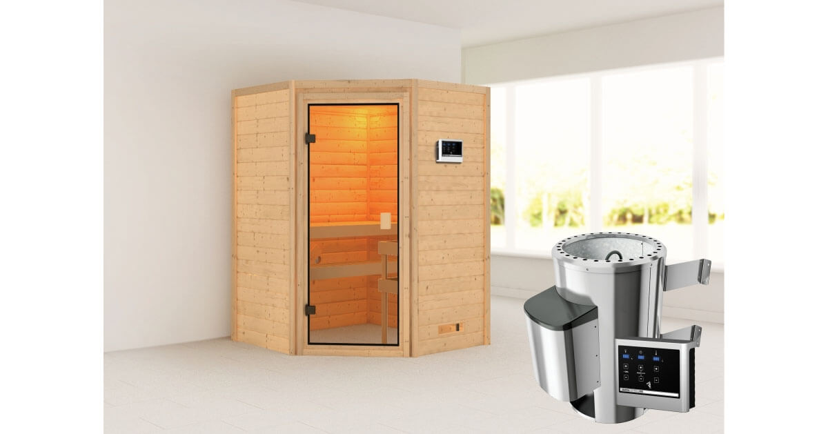 Die Sauna Antonia hat ein Außenmaß von 145 x 145 cm und ist, aufgrund seiner geringen Höhe von 187 cm, ideal auch für Räume mit einer niedrigen Deckenhöhe geeignet. Die Massivholzsauna besteht aus 38mm starken Wandbohlen aus nordischer Fichte, welche im einfachen Steck- und Schraubsystem montiert werden. Durch den Eckeinstieg und die besondere, fünfeckige Form, sorgt die Sauna für ein Highlight in Ihrer Wellness-Oase. Mit einem optional wählbaren Dachkranz inkl. 3 LED-Spots, können Sie die Sauna von außen beleuchten und sie so gekonnt in Szene setzen. In den Innenraum gelangen Sie durch eine bronzierte Ganzglastür aus Einscheibensicherheitsglas. Damit beim Saunieren keine Wärme entweichen kann, wird die Tür durch eine Magnetverschlusstechnik geschlossen gehalten. Auf den, im Lieferumfang enthaltenen, Saunaliegen können Sie den Saunagang so richtig genießen. Entspannen Sie nach einem stressigen Arbeitstag und schöpfen Sie neue Kraft aus der angenehmen Wärme auf Ihrer Haut. Heizen Sie den Innenraum mit einem optional erhältlichen, steckerfertigen 3,6kW Ofen. Dieser hat den Vorteil, dass er einfach an eine hausübliche 240Volt Steckdose angeschlossen werden kann und so keine Montage- oder Umbaukosten erfordert. Oder wählen Sie unseren klassischen 4,5kW-Ofen. Dieser schafft, aufgrund der höheren Leistung, eine höhere maximale Temperatur. Beide Öfen sind in drei verschiedenen Varianten erhältlich. Nutzen Sie Ihren Kellerraum zur Entspannung und verwandeln Sie ihn in eine Wellness-Oase mit der Massivholzsauna Sauna Antonia.