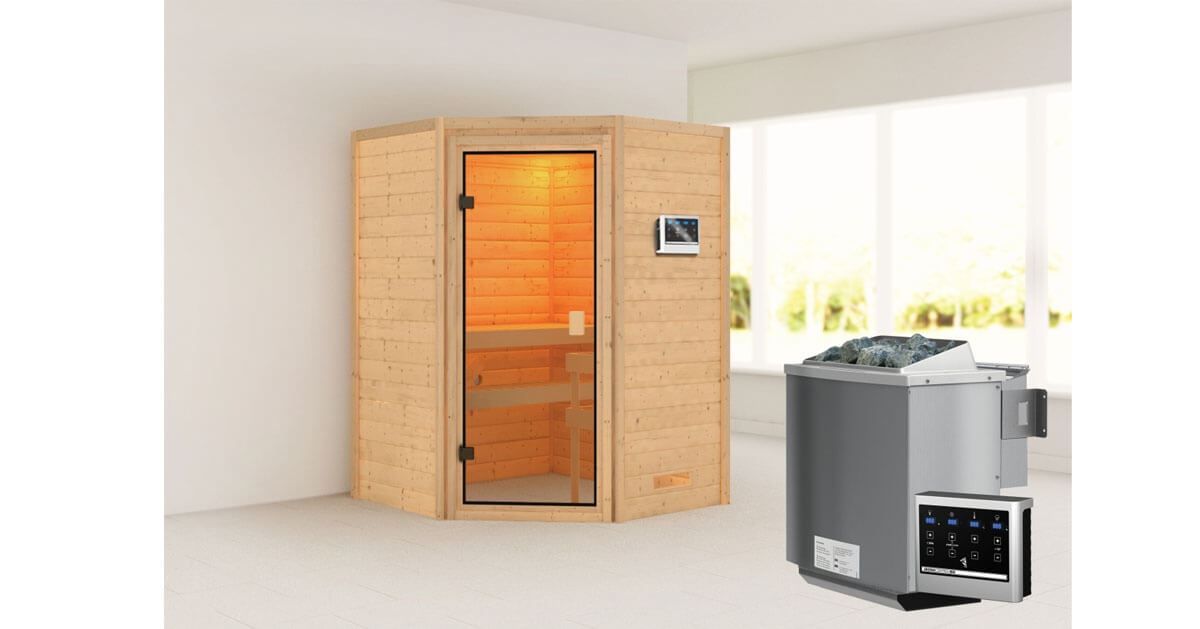 Karibu 38mm Massivholzsauna Antonia mit 9kW BIO-Kombiofen mit ext. Steuerung Easy
