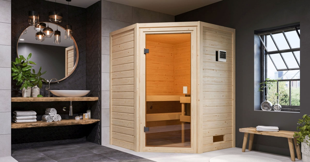 Was eignet sich für einen bislang ungenutzten Kellerraum besser, als eine eigene Sauna zum Entspannen und Wohlfühlen? Die Sauna Antonia hat ein Außenmaß von 145 x 145 cm und ist, aufgrund seiner geringen Höhe von 187 cm, ideal auch für Räume mit einer niedrigen Deckenhöhe geeignet. Die Massivholzsauna besteht aus 38mm starken Wandbohlen aus nordischer Fichte, welche im einfachen Steck- und Schraubsystem montiert werden. Durch den Eckeinstieg und die besondere, fünfeckige Form, sorgt die Sauna für ein Highlight in Ihrer Wellness-Oase. Mit einem optional wählbaren Dachkranz inkl. 3 LED-Spots, können Sie die Sauna von außen beleuchten und sie so gekonnt in Szene setzen. In den Innenraum gelangen Sie durch eine bronzierte Ganzglastür aus Einscheibensicherheitsglas. Damit beim Saunieren keine Wärme entweichen kann, wird die Tür durch eine Magnetverschlusstechnik geschlossen gehalten. Auf den, im Lieferumfang enthaltenen, Saunaliegen können Sie den Saunagang so richtig genießen. Entspannen Sie nach einem stressigen Arbeitstag und schöpfen Sie neue Kraft aus der angenehmen Wärme auf Ihrer Haut. Heizen Sie den Innenraum mit einem optional erhältlichen, steckerfertigen Ofen. Dieser hat den Vorteil, dass er einfach an eine hausübliche 240Volt Steckdose angeschlossen werden kann und so keine Montage- oder Umbaukosten erfordert. Oder wählen Sie unseren klassischen Ofen. Dieser schafft, aufgrund der höheren Leistung, eine höhere maximale Temperatur. Beide Öfen sind in drei verschiedenen Varianten erhältlich. Nutzen Sie Ihren Kellerraum zur Entspannung und verwandeln Sie ihn in eine Wellness-Oase mit der Massivholzsauna Sauna Antonia.