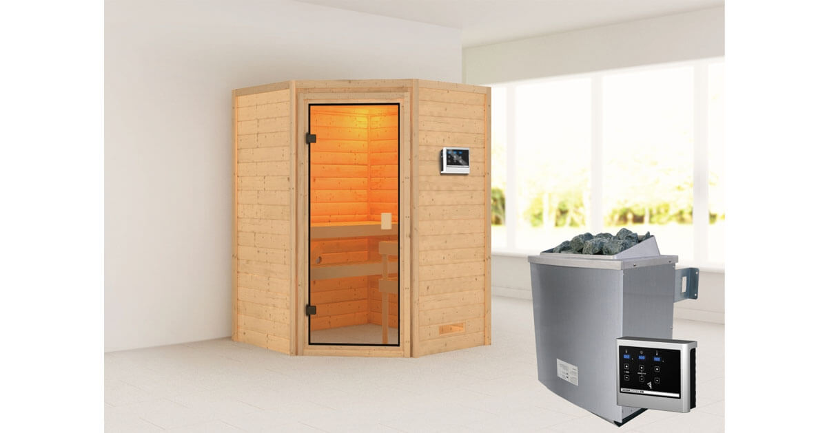 Karibu 38mm Massivholzsauna Antonia mit 9kW Saunaofen mit ext. Steuerung Easy