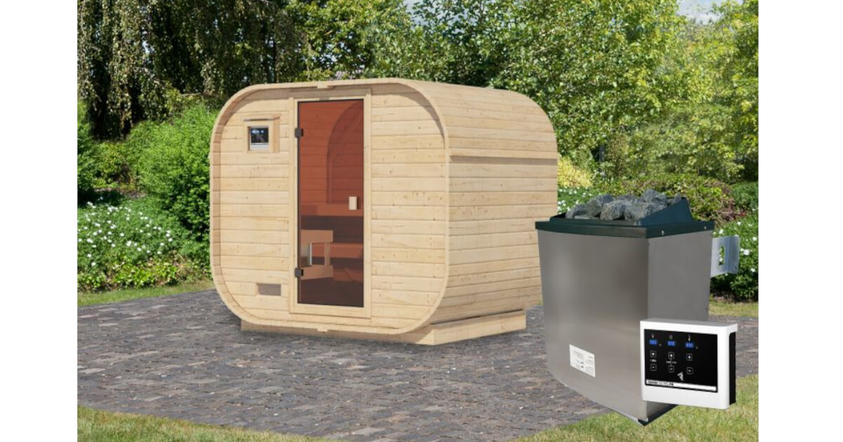 Karibu 38mm Fasssauna Quadro 1 Plus mit 9 kW Ofen mit externer Steuerung