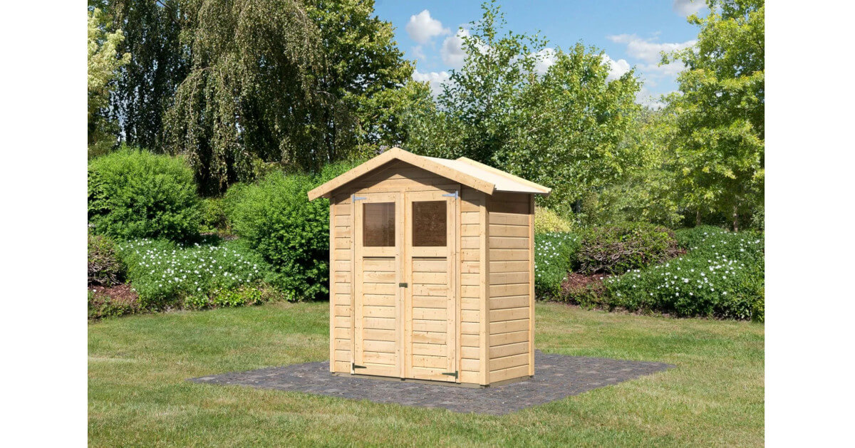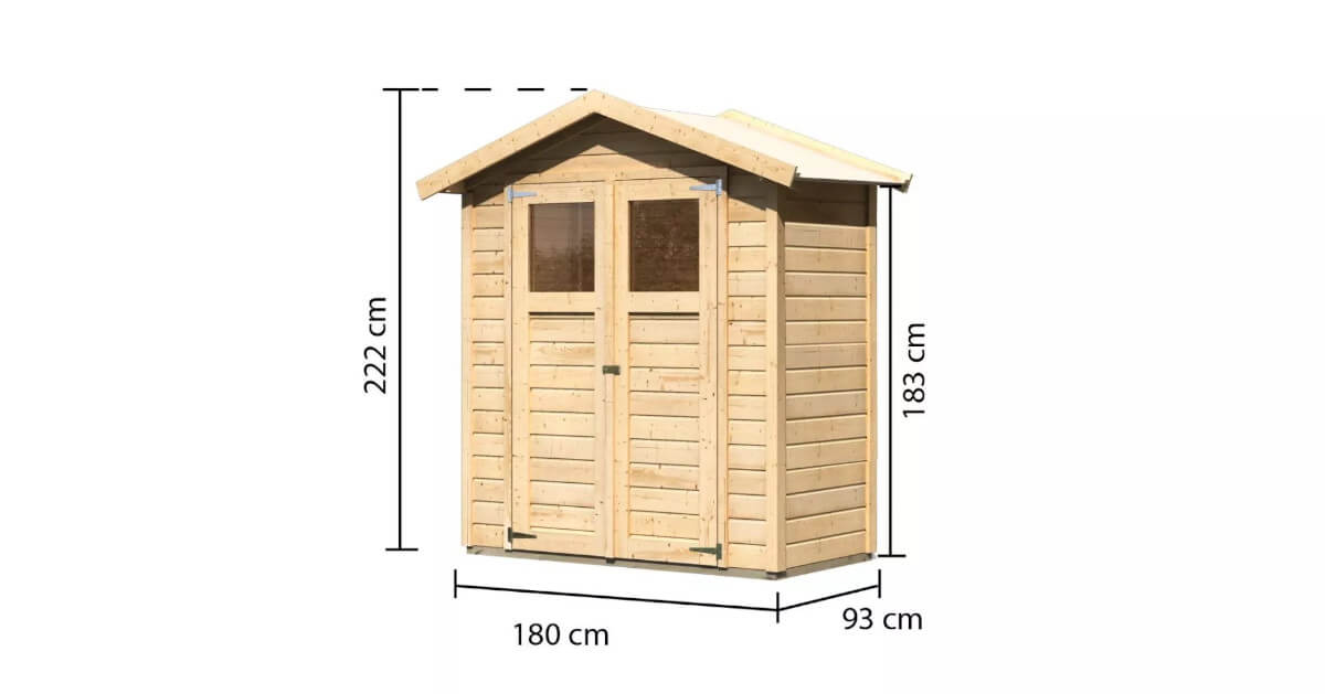 Das Gartenhaus Dahme 0 wird aus 14 mm starken Wandbrettern aus nordischer Fichte im Steck-/Schraubsystem gefertigt und gewährleistet somit einen einfachen Aufbau. Das Satteldach besteht aus Dachplatten. Die Grundfläche beträgt 1,51 m² bei einem umbauten Raum von 3,17 m³. Mit einer Seitenhöhe von 183 cm und einer Firsthöhe von 222 cm bietet das Gerätehaus optimale Raumnutzung. Das Gartenhaus ohne Anbauten hat ein Sockelmaß von 177 x 89,5 cm. Bodenbalken sorgen für den Schutz von unten und werden unter das Gartenhaus gelegt. Durch die Kesseldruckimprägnierung der Bodenbalken sind diese vor Witterungseinflüssen und holzzersetzenden Pilzen bereits geschützt. Die praktische und vormontierte Tür sorgt mit ihren großzügigen Abmessungen und dem Massivholzrahmen für einen einfachen Zutritt in das Gartenhaus und sichert den Inhalt nebenbei effektiv vor unbefugtem Zugriff. Die Verglasung der Lichtausschnitte sorgt für großzügigen Tageslichteinfall. Wer es doch ein wenig größer mag, sollte bei der großen Schwester Dahme 1 vorbeischauen!