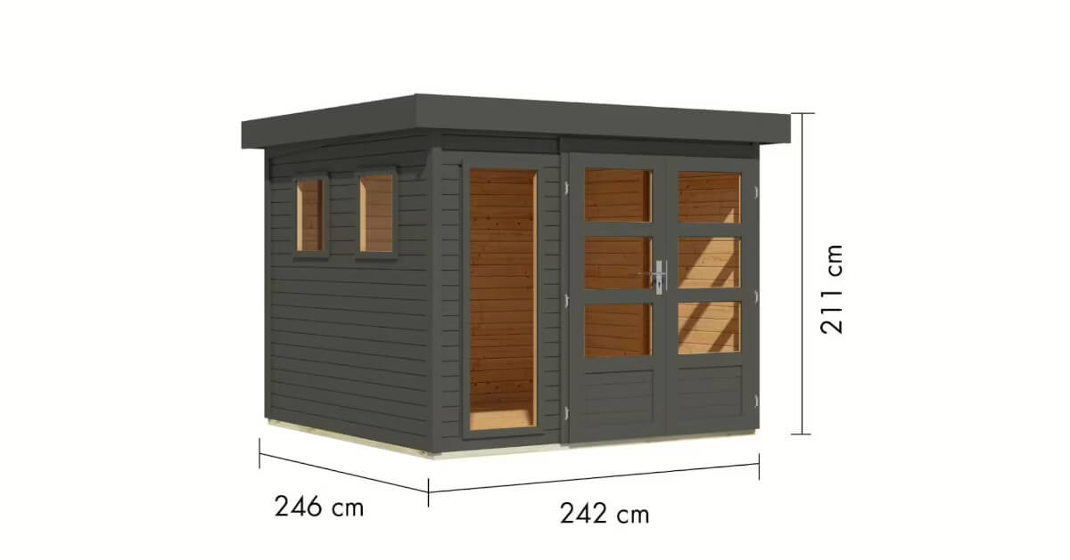 Die Grundfläche beträgt 5,76 qm bei einem umbauten Raum von 11,5 cbm. Mit einer Seitenhöhe von 195 cm und einer Firsthöhe von 211 cm bietet das Gerätehaus optimale Raumnutzung. Das Gartenhaus ohne Anbauten hat ein Sockelmaß von 238 cm x 242 cm. Bodenbalken sorgen für den Schutz von unten und werden unter das Gartenhaus gelegt. Durch die Kesseldruckimprägnierung der Bodenbalken sind diese vor Witterungseinflüssen und holzzersetzenden Pilzen bereits geschützt. Die praktische und vormontierte Tür sorgt mit ihren großzügigen Abmessungen und dem Massivholzrahmen für einen einfachen Zutritt in das Gartenhaus und sichert den Inhalt nebenbei effektiv vor unbefugtem Zugriff.