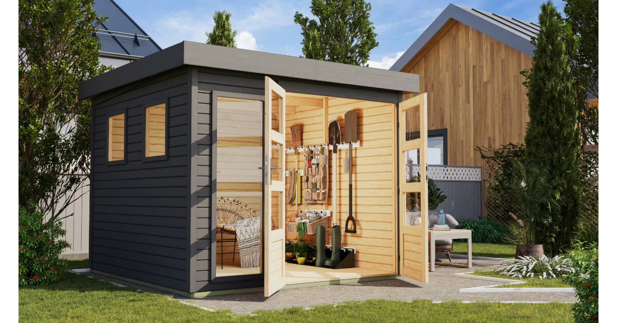 Das Gartenhaus wird aus 19 mm starken Wandbrettern aus nordischer Fichte im Steck-/Schraubsystem gefertigt und gewährleistet somit einen einfachen Aufbau. Das Flachdach besteht aus Dachplatte.
