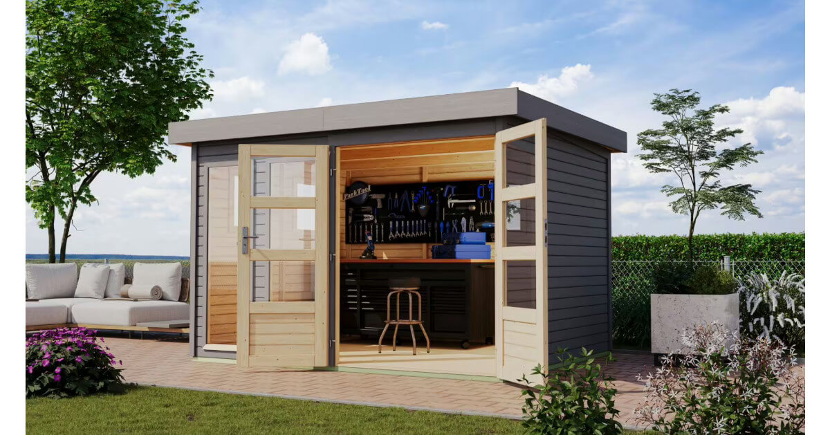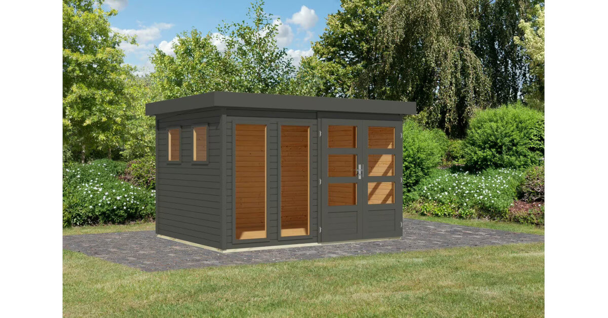 Das Gartenhaus wird aus 19 mm starken Wandbrettern aus nordischer Fichte im Steck-/Schraubsystem gefertigt und gewährleistet somit einen einfachen Aufbau. Das Flachdach besteht aus Dachplatte.