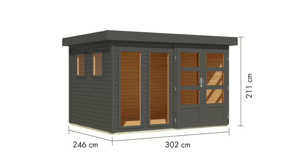 Die Grundfläche beträgt 7,21 qm bei einem umbauten Raum von 14,6 cbm. Mit einer Seitenhöhe von 195 cm und einer Firsthöhe von 211 cm bietet das Gerätehaus optimale Raumnutzung. Das Gartenhaus ohne Anbauten hat ein Sockelmaß von 298 cm x 242 cm. Bodenbalken sorgen für den Schutz von unten und werden unter das Gartenhaus gelegt. Durch die Kesseldruckimprägnierung der Bodenbalken sind diese vor Witterungseinflüssen und holzzersetzenden Pilzen bereits geschützt. Die praktische und vormontierte Tür sorgt mit ihren großzügigen Abmessungen und dem Massivholzrahmen für einen einfachen Zutritt in das Gartenhaus und sichert den Inhalt nebenbei effektiv vor unbefugtem Zugriff.