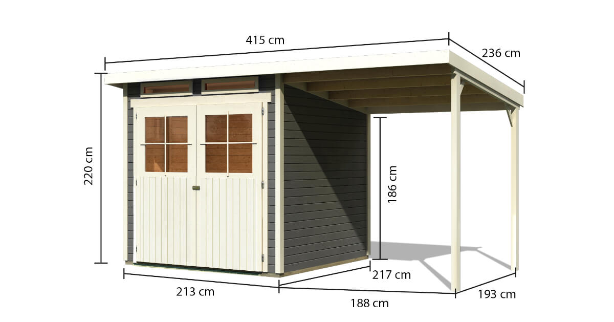 Das 19mm Gartenhaus Glücksburg 3 aus nordischer Fichte wird im Steck-/Schraubsystem montiert. Das Pultdachhaus ist in der Farbe terragrau sowie in naturbelassen erhältlich. Egal ob klassisch, modern oder elegant, hier ist garantiert für jeden etwas dabei. Die klassische Doppelflügeltür mit einem Lichtausschnitt pro Türflügel, sowie die feststehenden Oberlichtfenster aus bruchsicherem Kunstglas sorgen für ausreichend Licht im inneren. Der großzügig geschnittene Innenraum mit Maßen von 209 x205 cm bietet genügend Platz für Ihre Gartengeräte. Auch die Einrichtung einer kleinen Sitzgruppe ist möglich. So können Sie sich Ihr Gartenhaus nach den eigenen Vorstellungen einrichten und gestalten. Sollte der Platz im Inneren nicht ausreichen besteht die Möglichkeit eines zusätzlichen Anbaudaches. Dieses dient als weitere Unterstellmöglichkeit von Ihren Gartenutensilien und hat eine Breite von 190 cm. Das Pultdachhaus mit einer Dachfläche von 5,5m² bietet den Gegenständen im Inneren Schutz vor der Witterung. Von unten schützen kesseldruckimprägnierte Bodenbalken vor aufsteigender Nässe. Mit dem optional erhältlichen Fußboden oder unserer selbstklebenden Dachfolie können Sie das Gesamtbild abrunden. Sorgen Sie für Ordnung in Ihrem Garten und schützen Sie Ihre Gartengeräte und möbel mit dem Gartenhaus Glücksburg 3.
