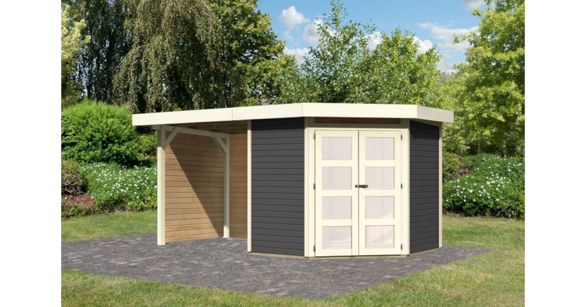 Unser Flachdach mit interessantem Grundriss. Ein Fünfeckhaus, welches das Ambiente Ihres Gartens abrundet? Ein echter Hingucker in einem sonst schlichten Umfeld? Das ist mit dem Gartenhaus Goldendorf 3 möglich. Gestalten Sie sich in Ihrem Garten Ihren eigenen Rückzugsort. Entspannen Sie in dem 209 x cm großen Innenraum mit einem Buch oder genießen Sie die ersten Sonnenstrahlen unter dem optional erhältlichen Vordach. Das Gartenhaus Goldendorf ist in naturbelassen und in terragrau erhältlich. Gestalten Sie das naturbelassene Holz ganz nach Ihren Vorstellungen. Streichen Sie es in Ihrer Lieblingsfarbe an oder behalten Sie die natürliche Farbe des Holzes mit einer Holzschutzlasur bei. Das moderne terragrau, mit Akzenten in elfenbeinweiß, schafft das gewisse Etwas in Ihrem Garten. Durch den integrierten Holzschutz erleichtern Sie sich die Arbeit und können direkt mit dem Aufbau beginnen. So ist für jeden garantiert das Richtige dabei. Das Innere des Gartenhauses erreichen Sie durch eine Doppelflügeltür mit vier Lichtausschnitten in Milchglasoptik, welche durch eine Sicherheitsüberfalle gleichzeitig vor unbefugtem Betreten schützt. Auch der Platz im Inneren kann frei nach den eigenen Wünschen eingerichtet werden. Egal ob mit einem gemütlichen Sofa oder einer Werkbank. Das Gartenhaus Goldendorf 3 passt sich den Vorstellungen an. Nutzen Sie die Ecke Ihres Gartens mit dem Fünfeckhaus Goldendorf 3.