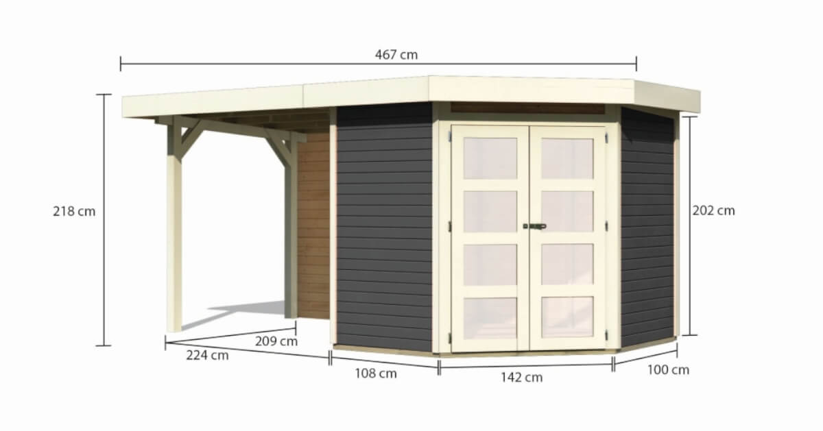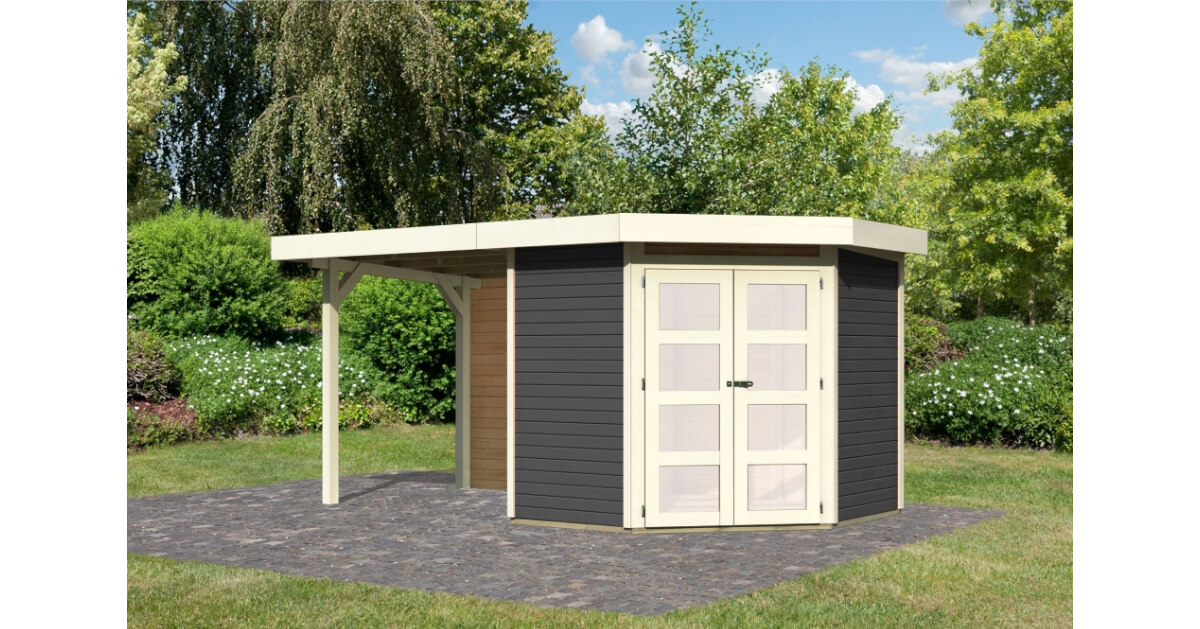 Unser Flachdach mit interessantem Grundriss. Ein Fünfeckhaus, welches das Ambiente Ihres Gartens abrundet? Ein echter Hingucker in einem sonst schlichten Umfeld? Das ist mit dem Gartenhaus Goldendorf 3 möglich. Gestalten Sie sich in Ihrem Garten Ihren eigenen Rückzugsort. Entspannen Sie in dem 209 x cm großen Innenraum mit einem Buch oder genießen Sie die ersten Sonnenstrahlen unter dem optional erhältlichen Vordach. Das Gartenhaus Goldendorf ist in naturbelassen und in terragrau erhältlich. Gestalten Sie das naturbelassene Holz ganz nach Ihren Vorstellungen. Streichen Sie es in Ihrer Lieblingsfarbe an oder behalten Sie die natürliche Farbe des Holzes mit einer Holzschutzlasur bei. Das moderne terragrau, mit Akzenten in elfenbeinweiß, schafft das gewisse Etwas in Ihrem Garten. Durch den integrierten Holzschutz erleichtern Sie sich die Arbeit und können direkt mit dem Aufbau beginnen. So ist für jeden garantiert das Richtige dabei. Das Innere des Gartenhauses erreichen Sie durch eine Doppelflügeltür mit vier Lichtausschnitten in Milchglasoptik, welche durch eine Sicherheitsüberfalle gleichzeitig vor unbefugtem Betreten schützt. Auch der Platz im Inneren kann frei nach den eigenen Wünschen eingerichtet werden. Egal ob mit einem gemütlichen Sofa oder einer Werkbank. Das Gartenhaus Goldendorf 3 passt sich den Vorstellungen an. Nutzen Sie die Ecke Ihres Gartens mit dem Fünfeckhaus Goldendorf 3.