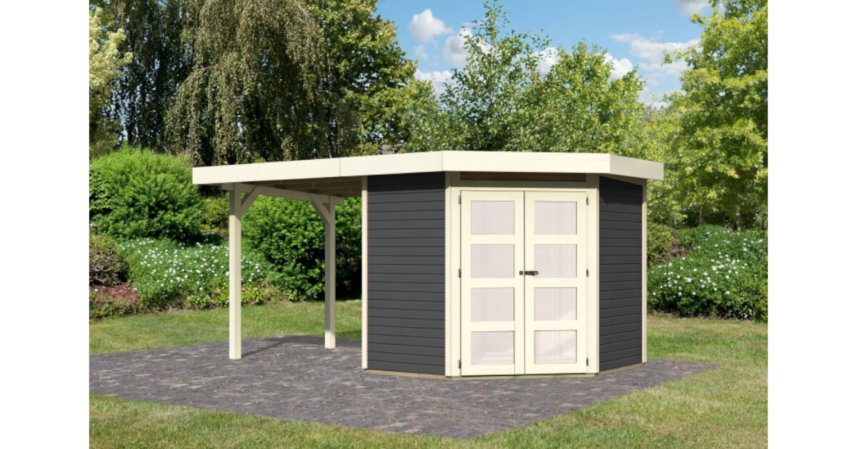 Unser Flachdach mit interessantem Grundriss. Ein Fünfeckhaus, welches das Ambiente Ihres Gartens abrundet? Ein echter Hingucker in einem sonst schlichten Umfeld? Das ist mit dem Gartenhaus Goldendorf 3 möglich. Gestalten Sie sich in Ihrem Garten Ihren eigenen Rückzugsort. Entspannen Sie in dem 209 x cm großen Innenraum mit einem Buch oder genießen Sie die ersten Sonnenstrahlen unter dem optional erhältlichen Vordach. Das Gartenhaus Goldendorf ist in naturbelassen und in terragrau erhältlich. Gestalten Sie das naturbelassene Holz ganz nach Ihren Vorstellungen. Streichen Sie es in Ihrer Lieblingsfarbe an oder behalten Sie die natürliche Farbe des Holzes mit einer Holzschutzlasur bei. Das moderne terragrau, mit Akzenten in elfenbeinweiß, schafft das gewisse Etwas in Ihrem Garten. Durch den integrierten Holzschutz erleichtern Sie sich die Arbeit und können direkt mit dem Aufbau beginnen. So ist für jeden garantiert das Richtige dabei. Das Innere des Gartenhauses erreichen Sie durch eine Doppelflügeltür mit vier Lichtausschnitten in Milchglasoptik, welche durch eine Sicherheitsüberfalle gleichzeitig vor unbefugtem Betreten schützt. Auch der Platz im Inneren kann frei nach den eigenen Wünschen eingerichtet werden. Egal ob mit einem gemütlichen Sofa oder einer Werkbank. Das Gartenhaus Goldendorf 3 passt sich den Vorstellungen an. Nutzen Sie die Ecke Ihres Gartens mit dem Fünfeckhaus Goldendorf 3.