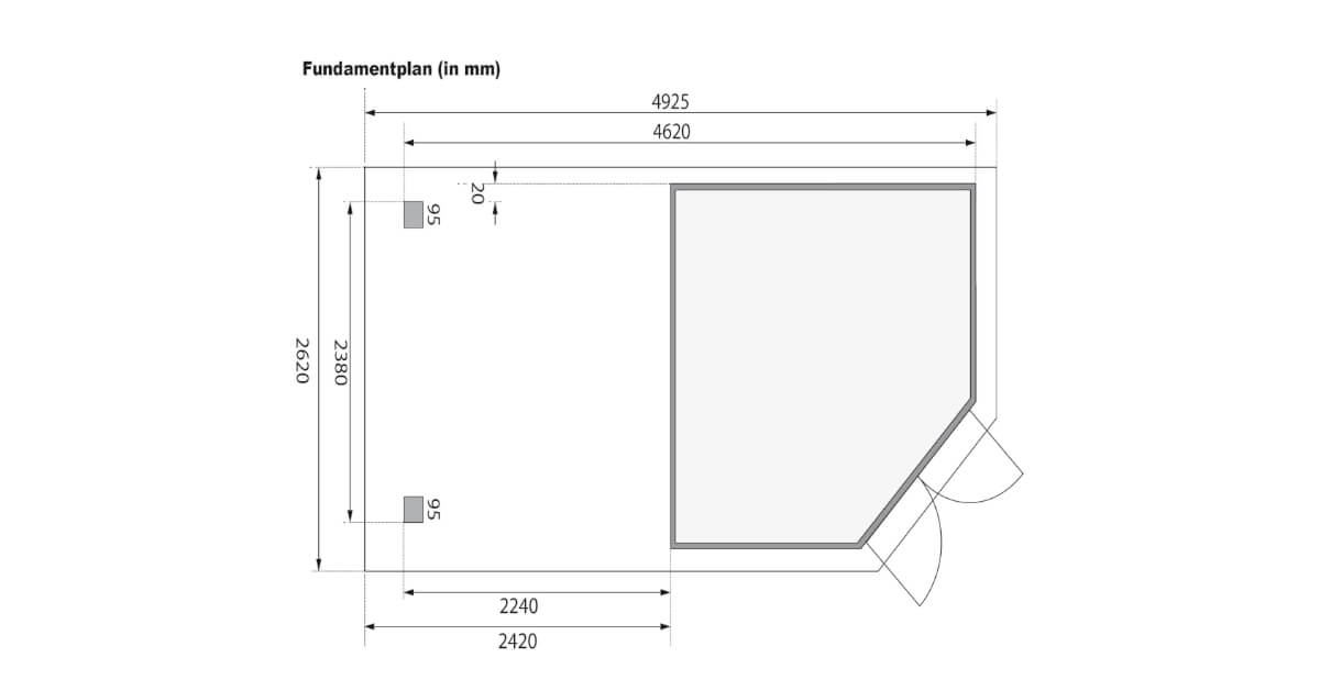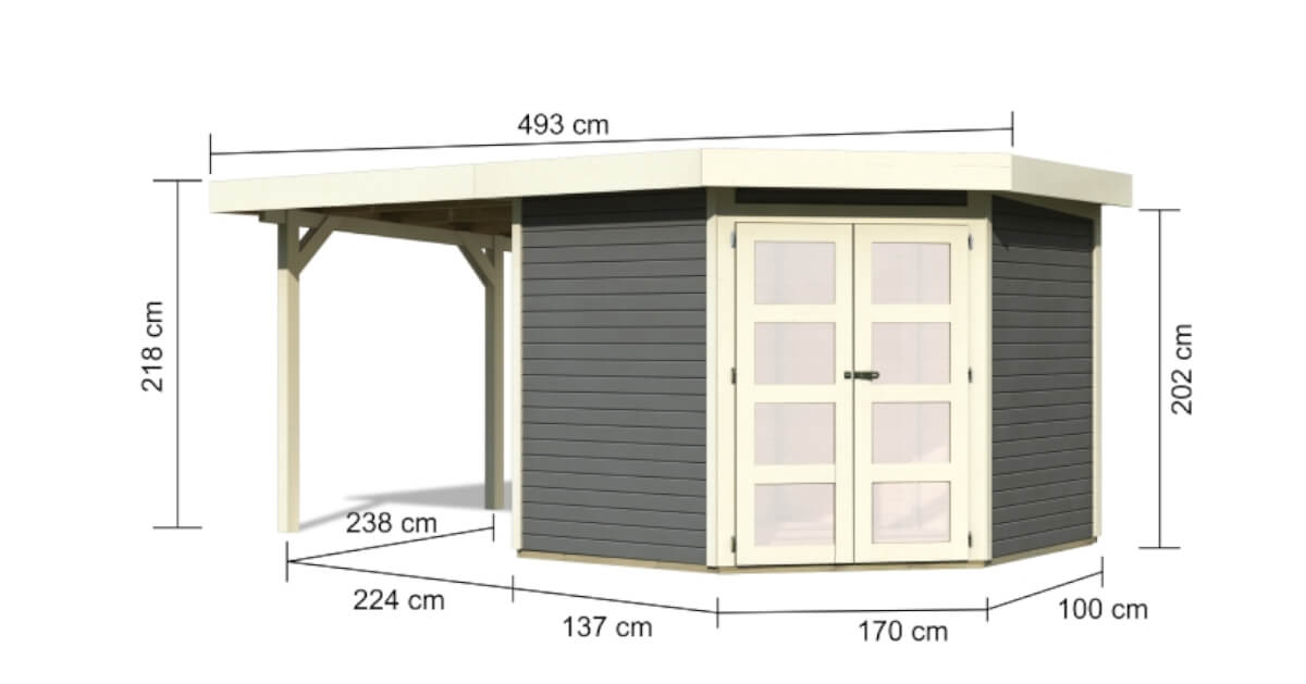 Unser Flachdach mit interessantem Grundriss. Ein Fünfeckhaus, welches das Ambiente Ihres Gartens abrundet? Ein echter Hingucker in einem sonst schlichten Umfeld? Das ist mit dem Gartenhaus goldendorf 5 möglich. Gestalten Sie sich in Ihrem Garten Ihren eigenen Rückzugsort. Entspannen Sie in dem 234 x 234 cm großen Innenraum mit einem Buch oder genießen Sie die ersten Sonnenstrahlen unter dem optional erhältlichen Vordach. Das Gartenhaus Goldendorf ist in naturbelassen und in terragrau erhältlich. Gestalten Sie das naturbelassene Holz ganz nach Ihren Vorstellungen. Streichen Sie es in Ihrer Lieblingsfarbe an oder behalten Sie die natürliche Farbe des Holzes mit einer Holzschutzlasur bei. Das moderne terragrau, mit Akzenten in elfenbeinweiß, schafft das gewisse Etwas in Ihrem Garten. Durch den integrierten Holzschutz erleichtern Sie sich die Arbeit und können direkt mit dem Aufbau beginnen. So ist für jeden garantiert das Richtige dabei. Das Innere des Gartenhauses erreichen Sie durch eine Doppelflügeltür mit vier Lichtausschnitten in Milchglasoptik, welche durch eine Sicherheitsüberfalle gleichzeitig vor unbefugtem Betreten schützt. Auch der Platz im Inneren kann frei nach den eigenen Wünschen eingerichtet werden. Egal ob mit einem gemütlichen Sofa oder einer Werkbank. Das Gartenhaus goldendorf 5 passt sich den Vorstellungen an. Nutzen Sie die Ecke Ihres Gartens mit dem Fünfeckhaus Goldendorf 5.