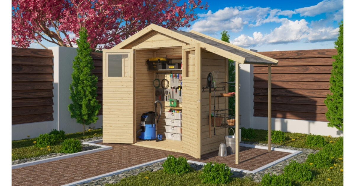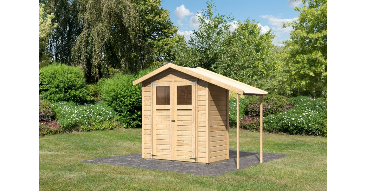 Das kleine, aber sehr praktische Gartenhaus Dana mit Satteldach und Schleppdach passt auch in kleinere Gärten und bietet Platz für Stauraum. Das Dana hat eine Wandstärke von 14mm und besteht aus nordischer Fichte. Das Innenmaß beträgt 174x86,5 cm bei einer Firsthöhe von 222 cm. Durch das praktische Schleppdach hat das Gartenhaus eine Dachbreite von insgesamt 283 cm. Somit kann das Schleppdach optimal als Unterstand für größere Gartengeräte oder Ihre Fahrräder genutzt werden. Durch die Doppelflügeltür mit 115,5x174 cm gelangen Sie bequem in das praktische Gartenhaus Dana. Das 16mm starke Dach aus Dachplatten schützt das Gartenhaus mit der richtigen Dacheindeckung optimal vor Witterungseinflüssen. Verschönern Sie Ihren Garten mit dem Gartenhaus Dana.