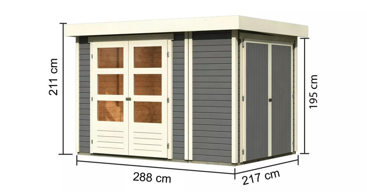 Das Multifunktionshaus unter den Gartenhäusern - so lässt sich unser Retola 2 am besten beschreiben. Das Gartenhaus mit einem Außenmaß von (BxT) 288 x 217 cm besteht aus naturbelassenem, 19mm starkem, nordischen Fichtenholz und wird durch ein einfaches Steck- und Schraubsystem montiert. Durch eine Doppelflügeltür mit drei Lichtausschnitten pro Türflügel gelangen Sie ins Innere des Gartenhauses. Diese sorgt für ausreichend Lichteinfall und wird mit einer Sicherheitsüberfalle verschlossen. Das Flachdach verleiht dem Haus seinen modernen Look. Das Besondere am Gartenhaus Retola 2: der integrierte Anbauschrank an der Seite des Hauses. Dieser bietet mit den Maßen (BxT) 77 x 217 cm ausreichend Platz für Ihre Gartengeräte. Somit haben Sie die Möglichkeit das Gartenhaus gleich doppelt zu nutzen. Während Sie im Anbauschrank Ihre Geräte verstauen, können Sie sich nach getaner Arbeit ins gemütlich eingerichtete Gartenhaus zurückziehen. Reicht der Raum dennoch nicht aus haben Sie die Möglichkeit die Stellfläche durch ein Anbaudach an der Seite des Gartenhauses zu erweitern. Das Anbaudach ist in den Breiten 2,40 m und 2,80 m erhältlich und kann nur auf der linken Seite des Gartenhauses montiert werden. Ergänzen Sie Ihr Gartenhaus Retola 2 durch den passenden Fußboden und verleihen Sie Ihrem Gartenhaus den letzten Schliff. Bitte beachten Sie, dass der Fußboden ausschließlich für das Gartenhaus vorgesehen ist und nicht für den Anbauschrank.