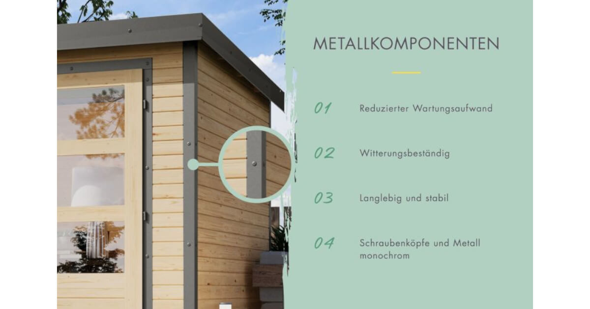 Ergänzt wird die solide Struktur durch wartungsfreie Blechelemente an Dach und Eckleisten, die nicht nur optimal vor Witterungseinflüssen schützen, sondern durch ihre langlebige Beschaffenheit auch dauerhaft ohne zusätzlichen Pflegeaufwand auskommen.