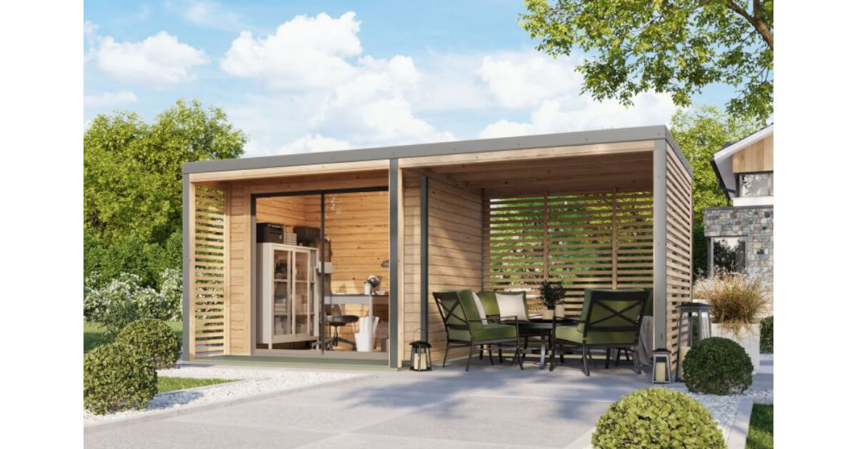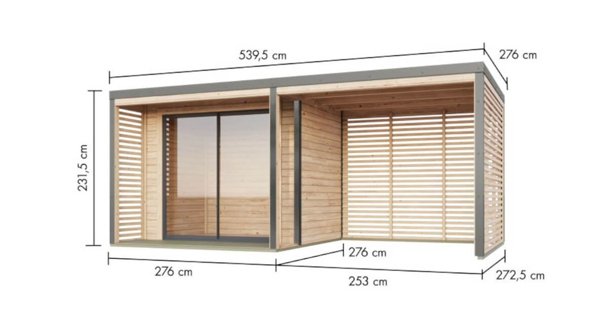 Karibu Gartenhaus Saturn A Naturbelassen / Graualuminium mit Anbaudach 537,5 x 276 cm