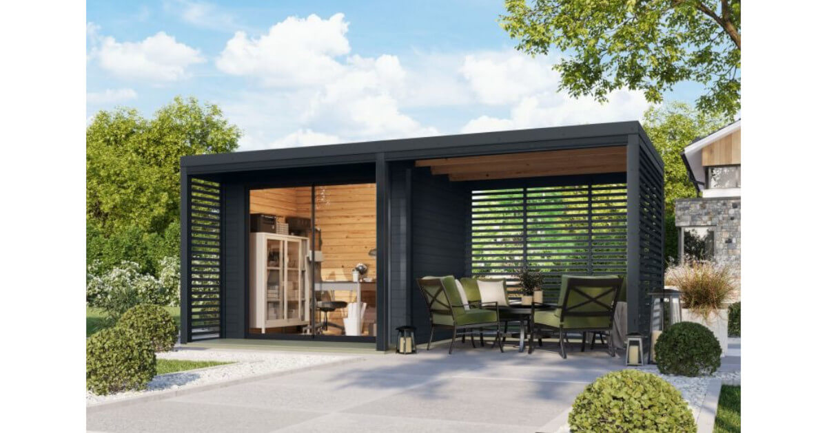 Karibu Gartenhaus Saturn B Anthrazit / Anthrazit mit Anbaudach 537,5 x 276 cm