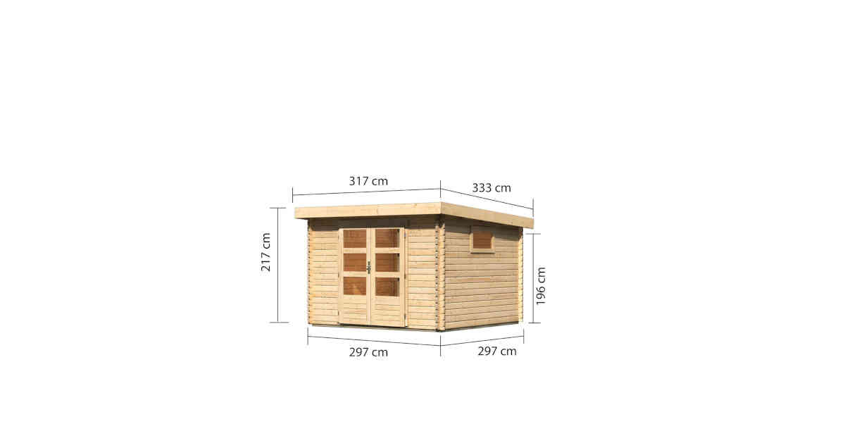 Für jeden Garten das Richtige mit dem Gartenhaus Trittau 5. Das Gartenhaus mit einer Wandstärke von 38 mm aus nordischem Fichtenholz wird in klassischer Blockbohlenbauweise montiert. Durch die patentierte 6-Plus-Eckverbindung erhält das Haus eine besondere Stabilität. Das Pultdachhaus aus Massivholz überzeugt durch seine moderne Optik. Die Doppelflügeltür mit drei Lichtausschnitten je Türflügel lässt viel Tageslicht ins Innere und sorgt so für eine natürliche Lichtquelle. Das Gartenhaus Trittau 5 ist in Naturbelassen und Terragrau erhältlich und lässt sich durch ein optional erhältliches Anbaudach in 3,30 m oder 4,40 m breite erweitern. Somit ist eine individuelle Gestaltung nach den eigenen Vorstellungen ohne weiteres möglich. Der Innenraum mit den Maßen (BxT) 364 x 274 cm ist großzügig geschnitten und bietet Ihnen eine große Vielfallt an Einrichtungsmöglichkeiten. So kann das Haus als Unterstellmöglichkeit für Ihre Gartengeräte, als Spielhaus für Ihre Kinder oder als gemütlichen Rückzugsort im eigenen Garten dienen. Ihrer Kreativität sind hier keine Grenzen gesetzt. Durch einen optional erhältlichen Fußboden und ein Fenster wird das Gartenhaus so richtig heimisch und ist bestimmt das Richtige für Ihren Garten.