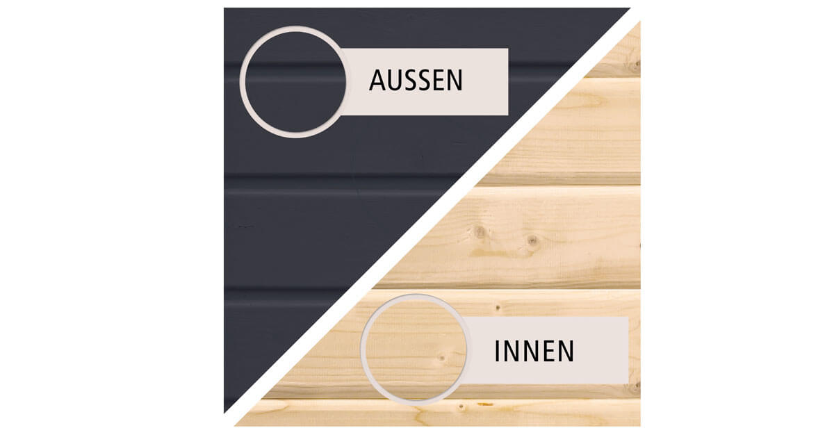 Hinweis: Die Wandinnenseiten, das Dach, der Boden und die Schnittkanten sind aus produktionstechnischen Gründen nicht endbehandelt und stellen somit einen Unterschied zur Außenseite dar. (Diese müssen nachbehandelt werden)