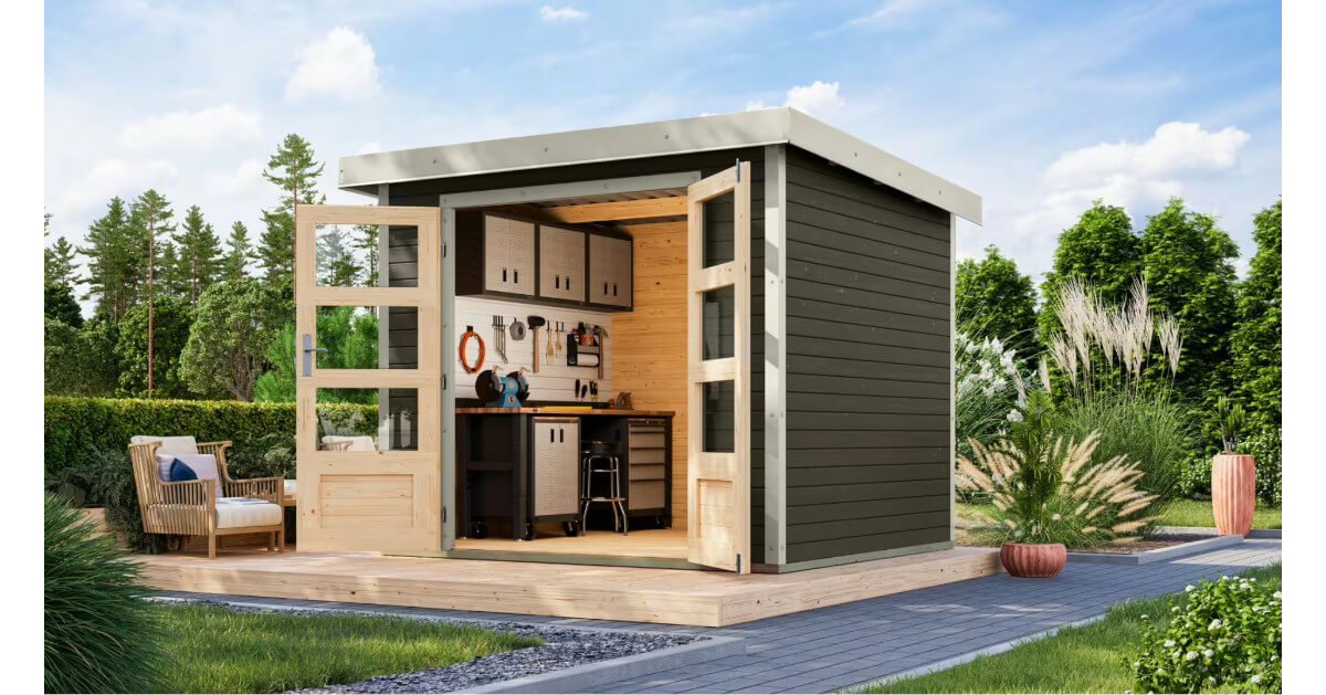 Das moderne Design des Metall-Holzgartenhauses verleiht Ihrem Garten eine zeitgemäße Optik. Die Kombination aus Holz und Metallelementen ist ein Blickfang für Besucher.