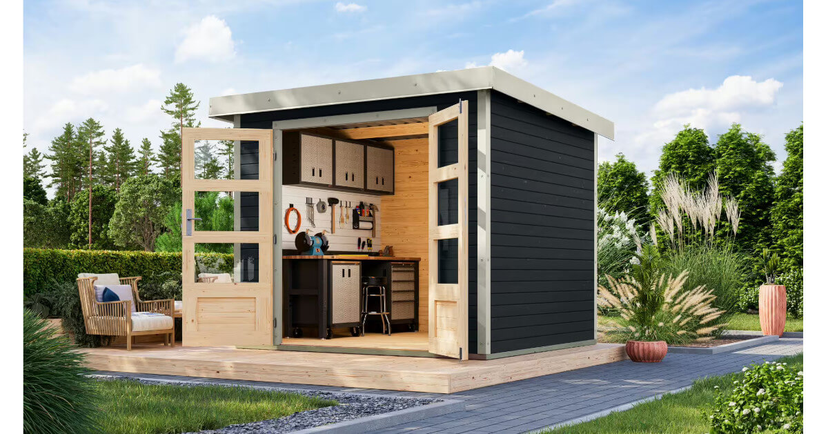 Das moderne Design des Metall-Holzgartenhauses verleiht Ihrem Garten eine zeitgemäße Optik. Die Kombination aus Holz und Metallelementen ist ein Blickfang für Besucher.