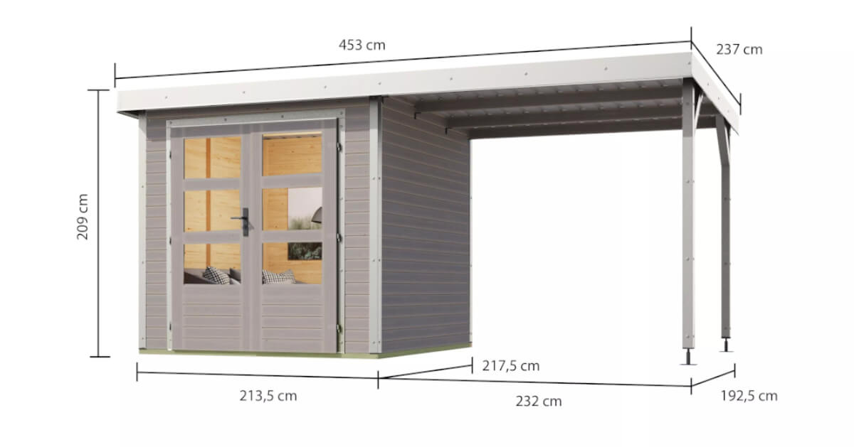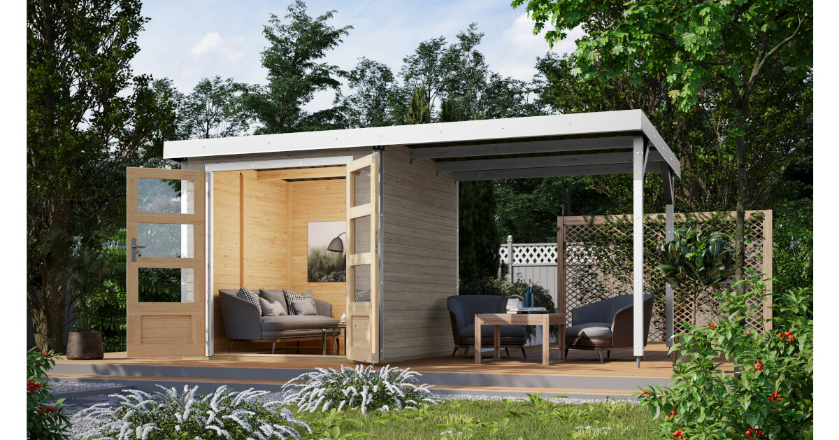 Mit dem optionalen Anbaudach erhalten Sie zusätzlichen Stauraum und erweiterte Nutzungsmöglichkeiten als Gartenlounge. Machen Sie es zu Ihrem persönlichen Rückzugsort.