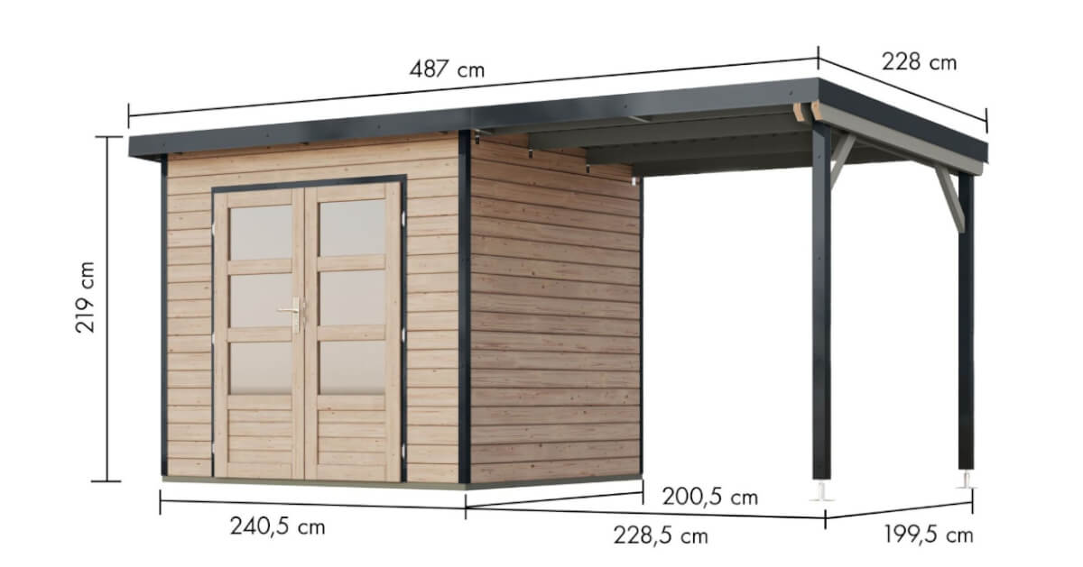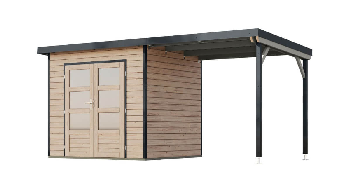 Karibu Hybrid Gartenhaus Pluto 2 A mit Anbau 2,33m 469 x 200,5 cm naturbelassen