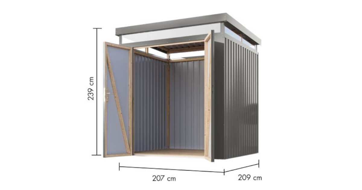 Ein weiteres Plus: Eine Regenrinne mit Fallrohr ist bereits im Lieferumfang enthalten. Für effiziente Wasserableitung, trockene Wände und zusätzliche Langlebigkeit der gesamten Konstruktion. Konstruiert und produziert in Deutschland steht dieses Metallhaus für Qualität, Präzision und langlebige Wertarbeit – eine Lösung, die heute begeistert und morgen überzeugt.