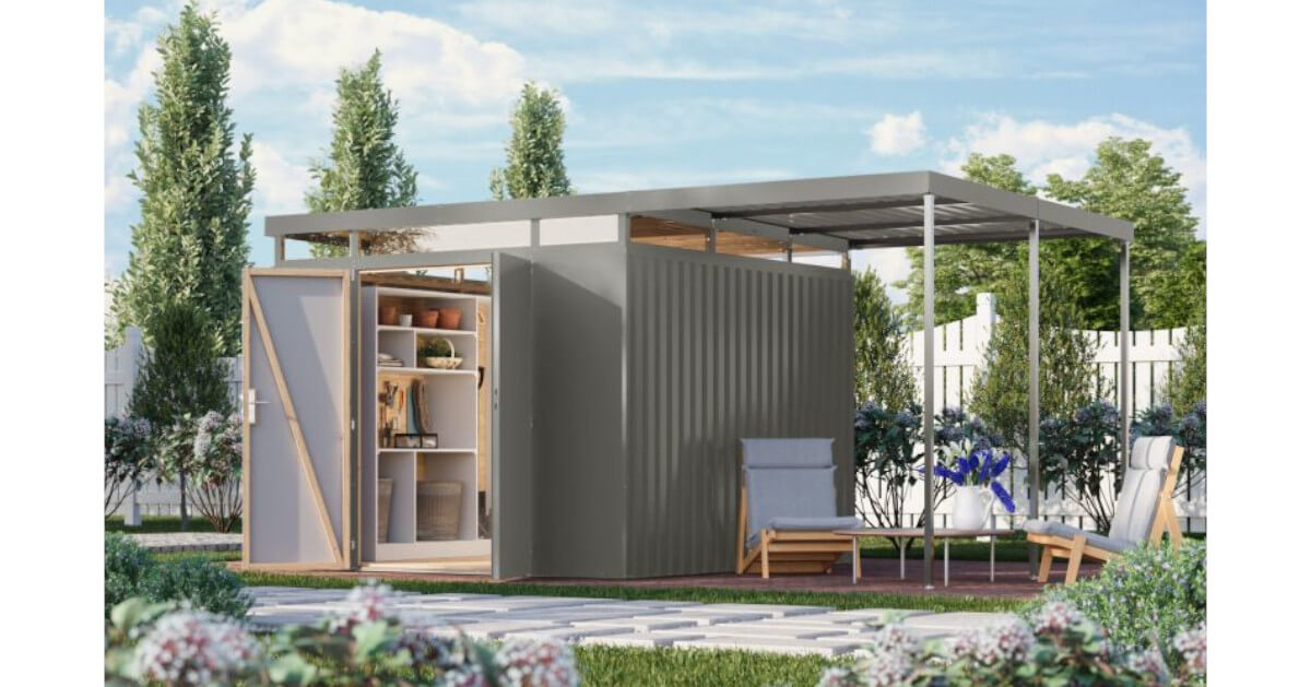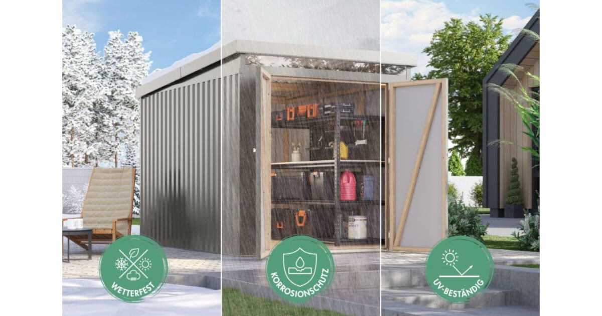 Ein weiteres Plus: Eine Regenrinne mit Fallrohr ist bereits im Lieferumfang enthalten. Für effiziente Wasserableitung, trockene Wände und zusätzliche Langlebigkeit der gesamten Konstruktion. Konstruiert und produziert in Deutschland steht dieses Metallhaus für Qualität, Präzision und langlebige Wertarbeit – eine Lösung, die heute begeistert und morgen überzeugt.