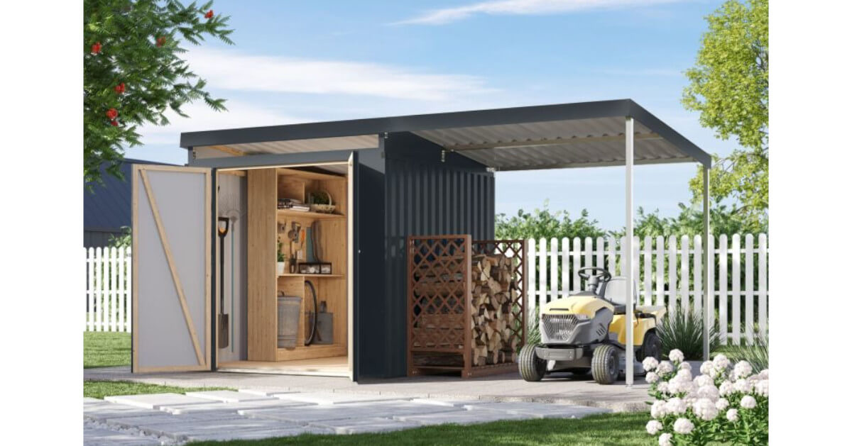 Entdecken Sie ein Metallhaus, das kompromisslose Stabilität mit moderner Ästhetik vereint. Die massive Konstruktion basiert auf einem verzugsfreien Leimholzrahmen, der nicht nur außergewöhnlich formstabil ist, sondern auch höchste Montagefreundlichkeit garantiert. Die Wände aus polyesterbeschichtetem Trapezblech, verleihen nicht nur eine ästhetische Note, sondern gewährleistet auch Langlebigkeit und Schutz vor den Elementen.