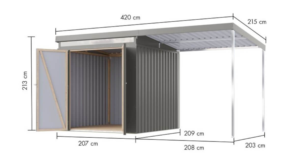 Entdecken Sie ein Metallhaus, das kompromisslose Stabilität mit moderner Ästhetik vereint. Die massive Konstruktion basiert auf einem verzugsfreien Leimholzrahmen, der nicht nur außergewöhnlich formstabil ist, sondern auch höchste Montagefreundlichkeit garantiert. Die Wände aus polyesterbeschichtetem Trapezblech, verleihen nicht nur eine ästhetische Note, sondern gewährleistet auch Langlebigkeit und Schutz vor den Elementen.