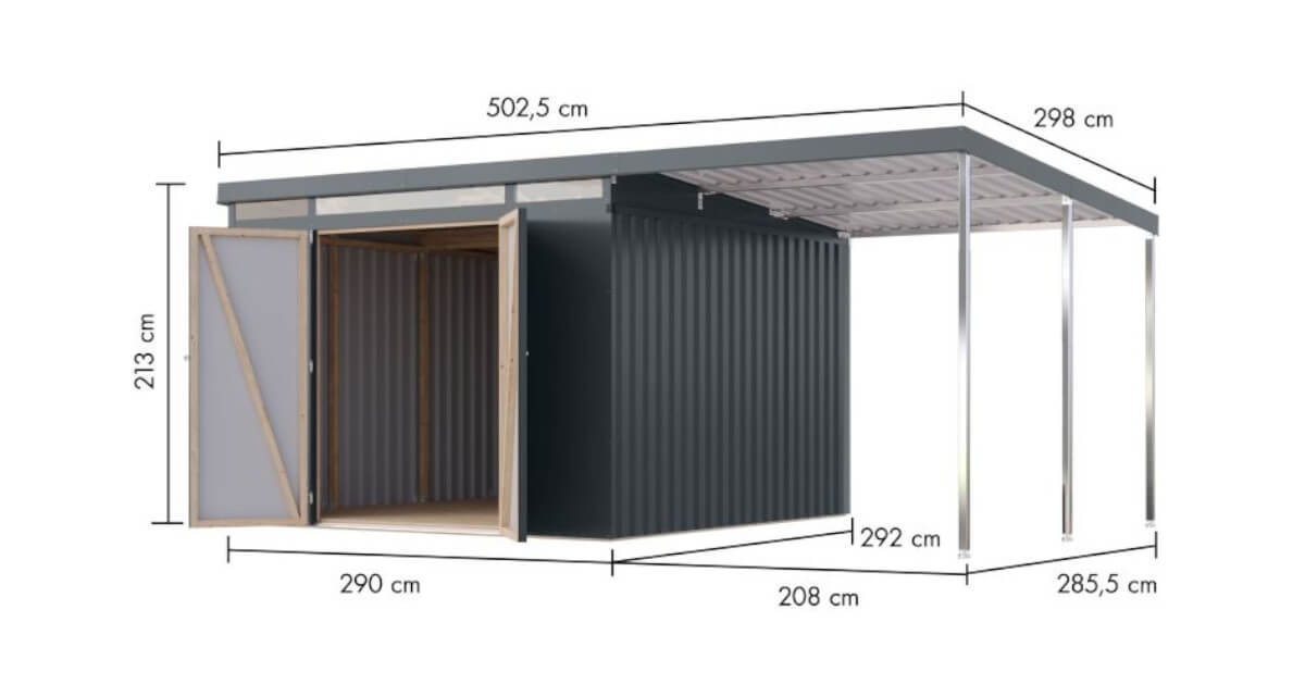 Entdecken Sie ein Metallhaus, das kompromisslose Stabilität mit moderner Ästhetik vereint. Die massive Konstruktion basiert auf einem verzugsfreien Leimholzrahmen, der nicht nur außergewöhnlich formstabil ist, sondern auch höchste Montagefreundlichkeit garantiert. Die Wände aus polyesterbeschichtetem Trapezblech, verleihen nicht nur eine ästhetische Note, sondern gewährleistet auch Langlebigkeit und Schutz vor den Elementen.