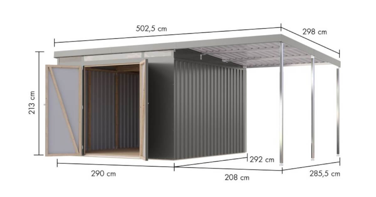 Entdecken Sie ein Metallhaus, das kompromisslose Stabilität mit moderner Ästhetik vereint. Die massive Konstruktion basiert auf einem verzugsfreien Leimholzrahmen, der nicht nur außergewöhnlich formstabil ist, sondern auch höchste Montagefreundlichkeit garantiert. Die Wände aus polyesterbeschichtetem Trapezblech, verleihen nicht nur eine ästhetische Note, sondern gewährleistet auch Langlebigkeit und Schutz vor den Elementen.
