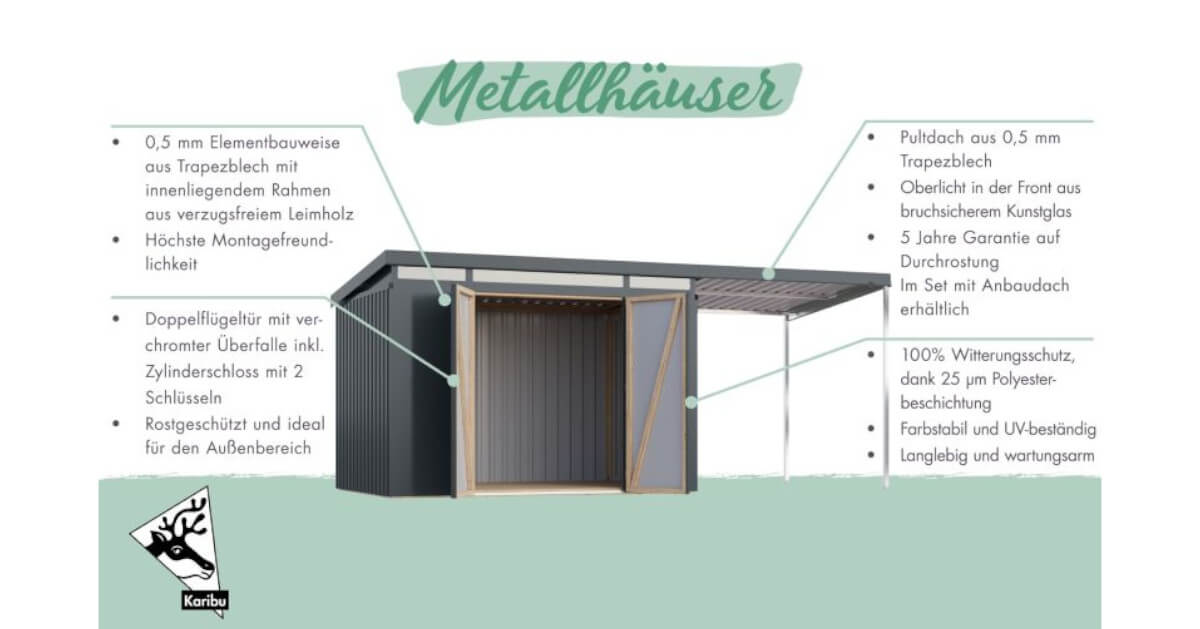 - 5 Jahre Garantie gegen Durchrostung: Auf unsere neuen, wertigen Metallhäuser aus Stahl bieten wir Ihnen 5 Jahre Garantie gegen Durchrostung, d.h. garantiert keine Löcher durch Rost an dem 0,5 mm verzinktem, pulverbeschichtetem Trapezblech oder an dem Rahmen aus verzinktem Stahl-Vierkantrohr.