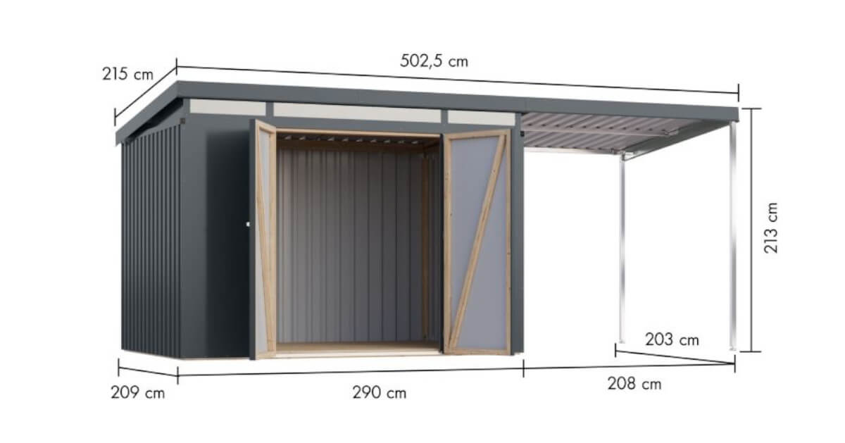 Entdecken Sie ein Metallhaus, das kompromisslose Stabilität mit moderner Ästhetik vereint. Die massive Konstruktion basiert auf einem verzugsfreien Leimholzrahmen, der nicht nur außergewöhnlich formstabil ist, sondern auch höchste Montagefreundlichkeit garantiert. Die Wände aus polyesterbeschichtetem Trapezblech, verleihen nicht nur eine ästhetische Note, sondern gewährleistet auch Langlebigkeit und Schutz vor den Elementen.